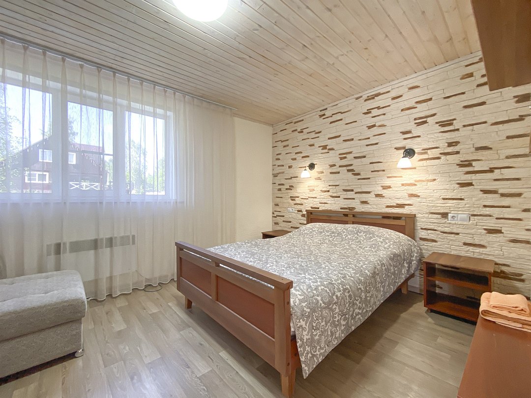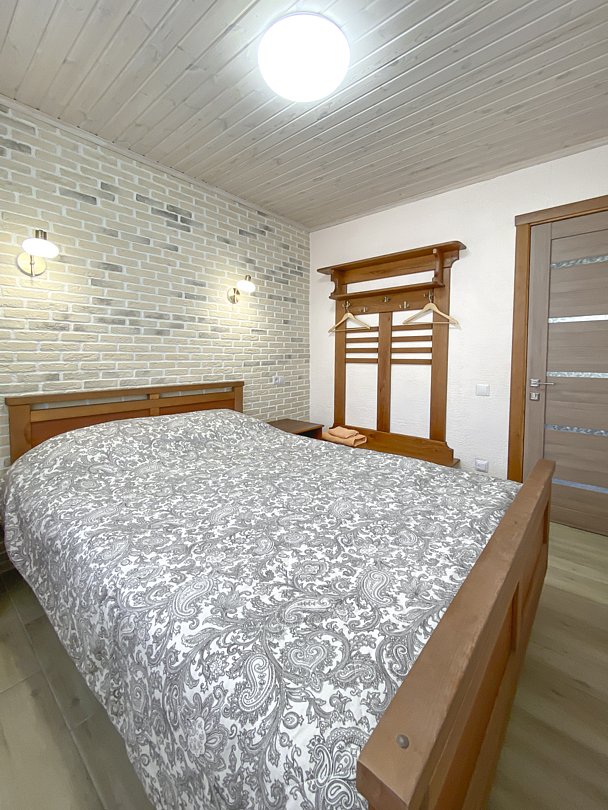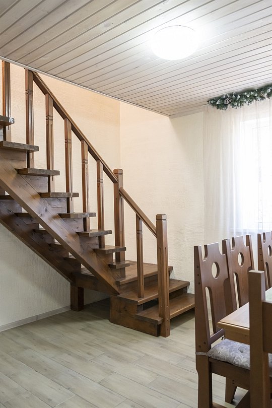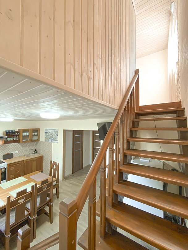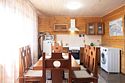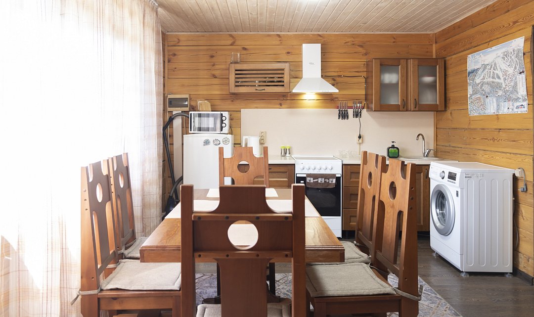 Двухэтажный дом рассчитан для проживания 10-ти – 12-ти гостей. На первом этаже дома расположены две жилые комнаты, один санузел и большая гостиная, совмещенная с кухней. На втором этаже - три спальни и санузел. Жилые комнаты оборудованы пятью двуспальными кроватями и одним диваном. В гостиной расположен большой стол, телевизор. Кухня оснащена плитой, холодильником, микроволновой печью, стиральной машиной, чайником, набором посуды. В санузле: душевая кабина, фен, косметический набор, полотенце. В доме есть теплый пол, сушилка для горнолыжного оборудования. Рядом с домом находится зона барбекю с крытой беседкой.Услуги и удобства