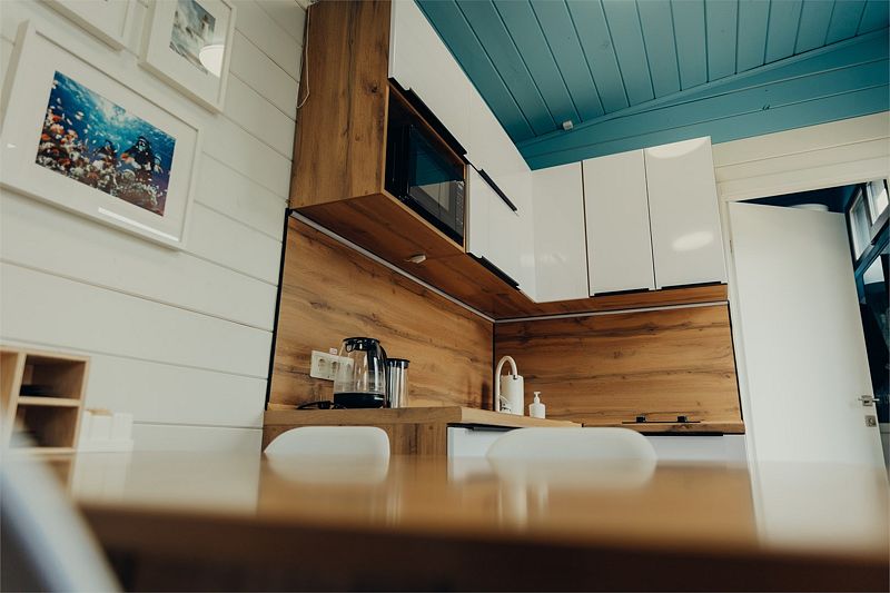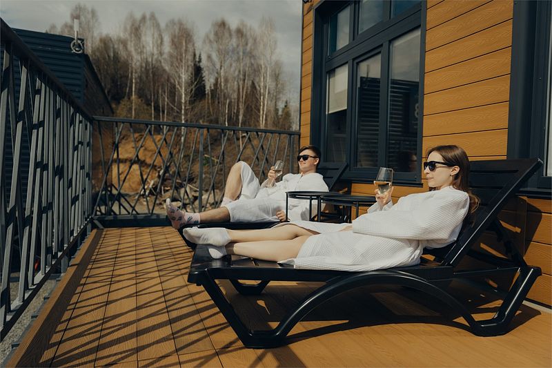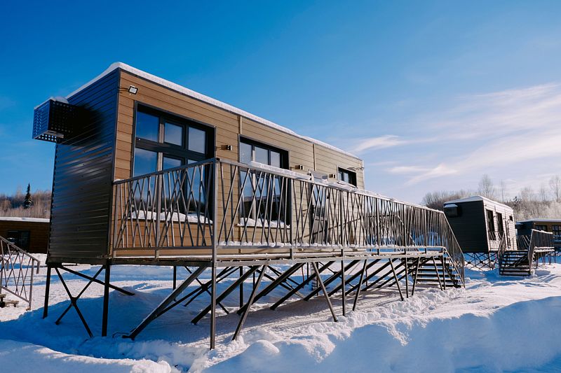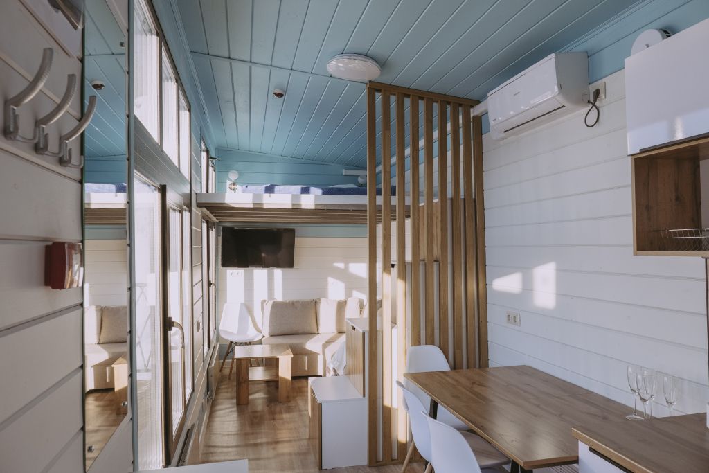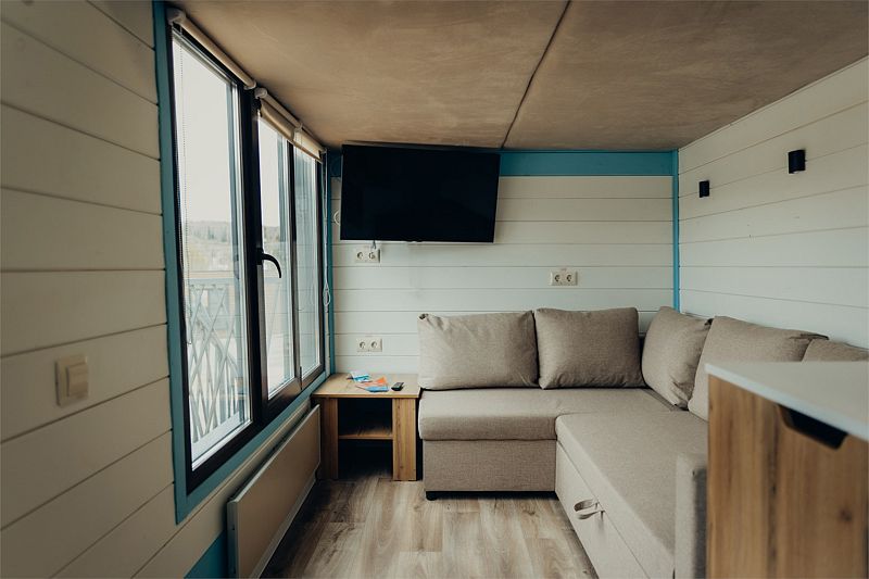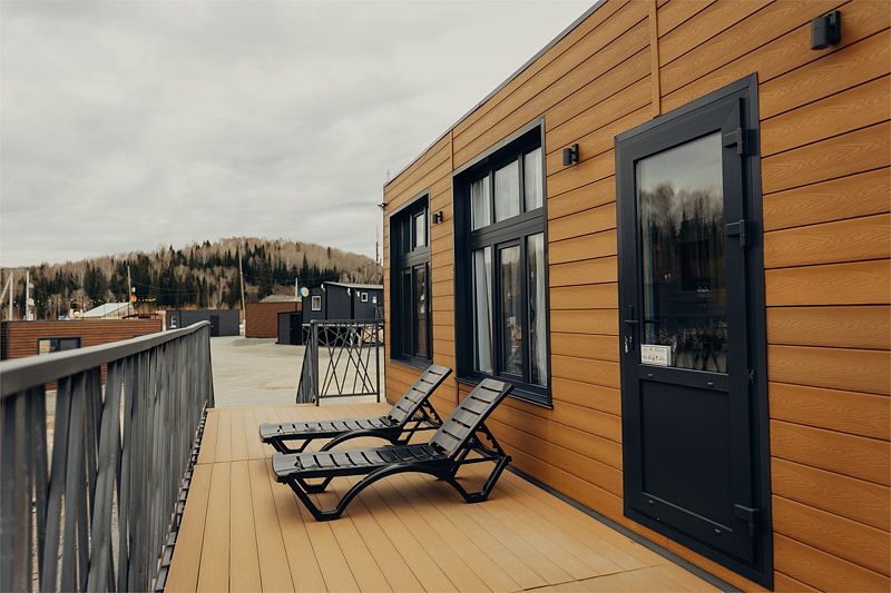 Гостевой дом категории «Стандарт» с видом на озеро рассчитан на проживание до 4 человек (имеется кухонная зона, зона отдыха и ванная). Площадь 19 кв.м. + собственная терраса (оборудованная шезлонгами, столом и стульями) — 22 кв.м.