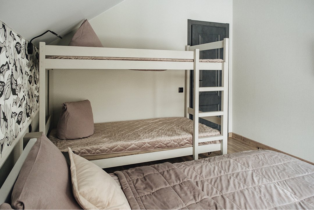 5 двуспальных кроватей, 2-ярусная кровать, ТВ, холодильник, кухонная зона со всем необходимым, теплые полы, фен, с/у с душем.