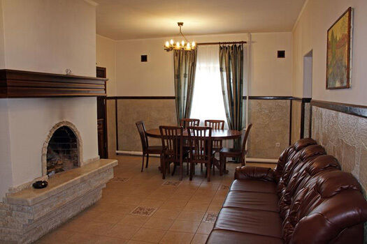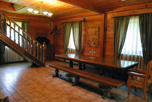 На первом этаже Гостевого дома есть два двухместных номера, меблированных односпальными кроватями, общий санузел, холл с камином, сервантом с посудой, стол и стулья. Есть холодильник, телевизор, DVD, караоке, баня без бассейна. На втором этаже – четыре двухместных номера с отдельными санузлами и большими двухспальными кроватями.