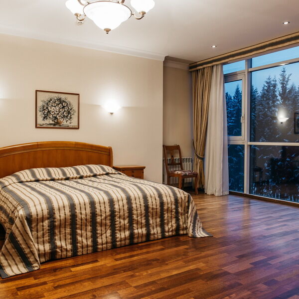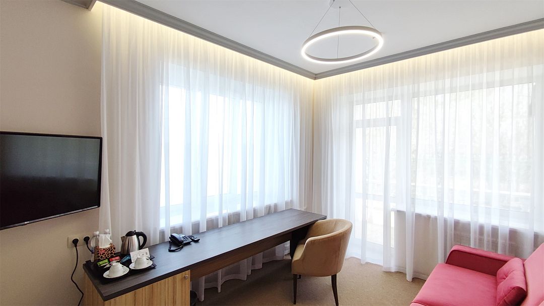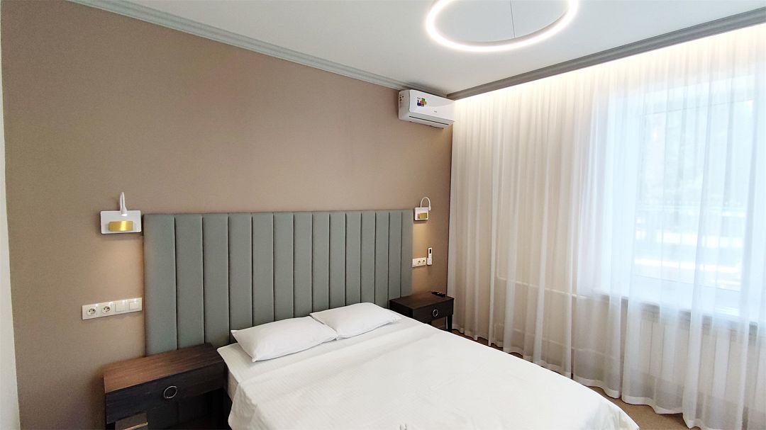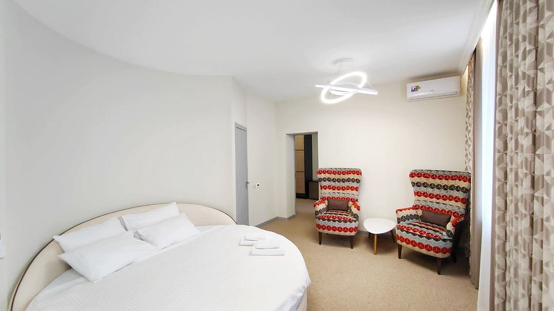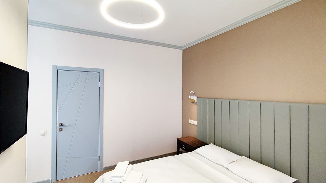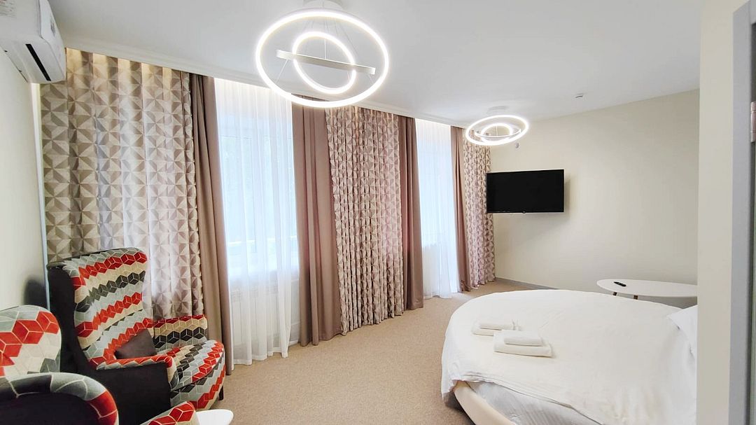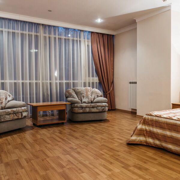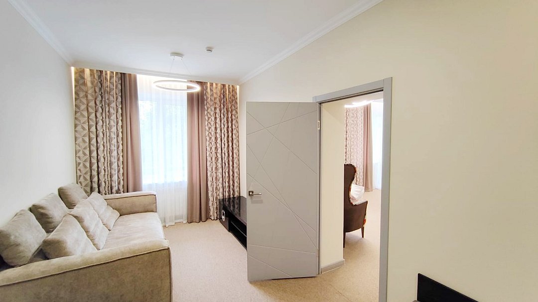 Новый номер повышенного удобства категории «Делюкс» с современным интерьером и изысканным дизайном. Расположен на первом этаже главного корпуса. Оснащен большой двуспальной кроватью, раскладывающимся двуспальным диваном. Оборудован кондиционером, холодильником, телевизором со смарт ТВ, беспроводным интернетом и современной сантехникой. Фотографии номеров могут отличаться.