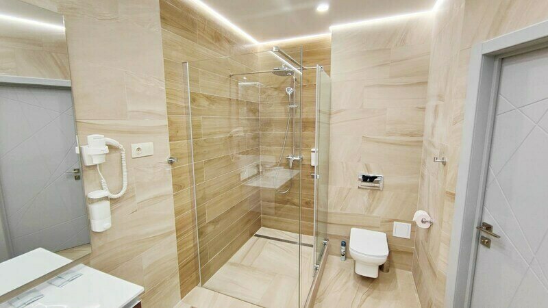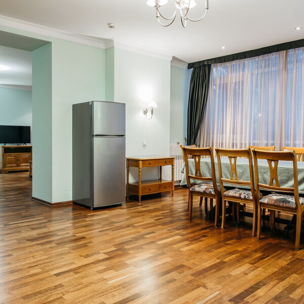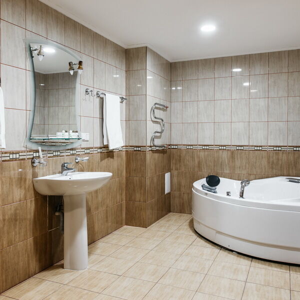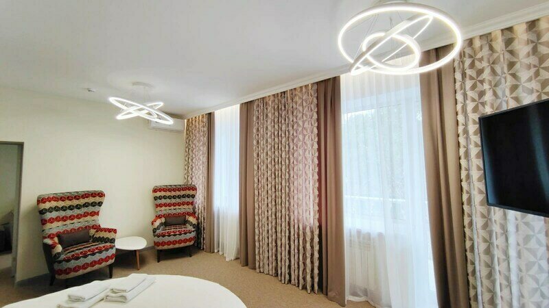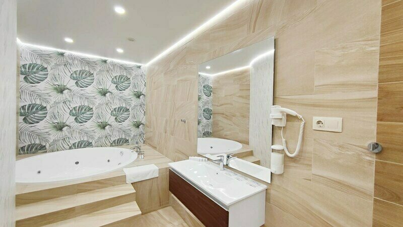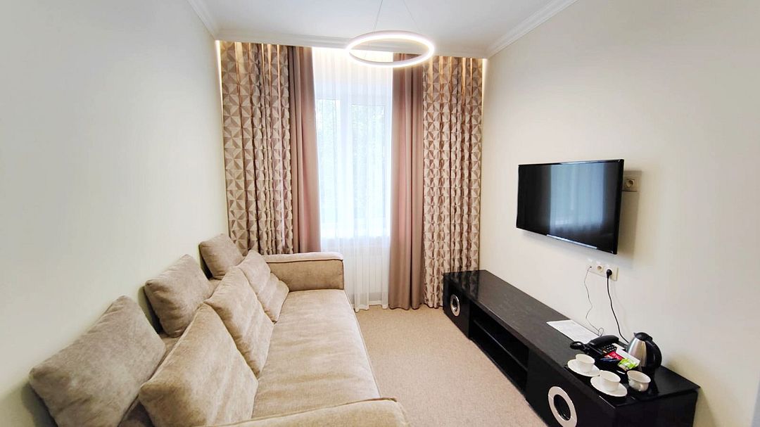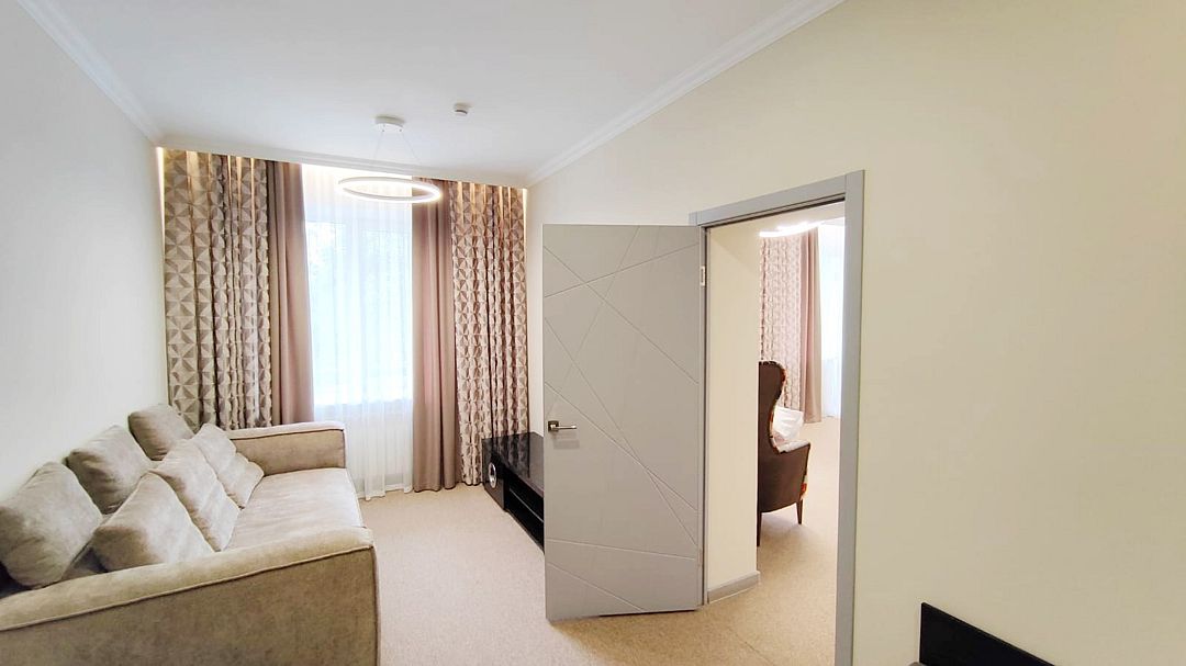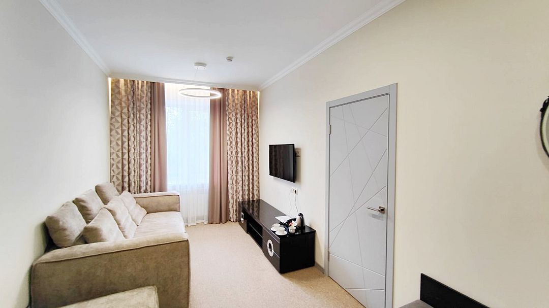 Новый современный и комфортный номер в корпусе «СПА». Оснащен большой двуспальной кроватью или двумя односпальными и раскладывающимся двуспальным диваном. Для гостей предоставляются доп. места за дополнительную плату. Интерьер выполнен в стиле современной классики: благородные натуральные материалы и текстуры образуют неповторимую игру фактур и цветов. Нейтральные оттенки, использованные в оформлении интерьера, создают атмосферу гармонии и уюта. Все номера оборудованы кондиционером, холодильником, телевизором со смарт ТВ, беспроводным интернетом и современной сантехникой. Фотографии номеров могут отличаться.