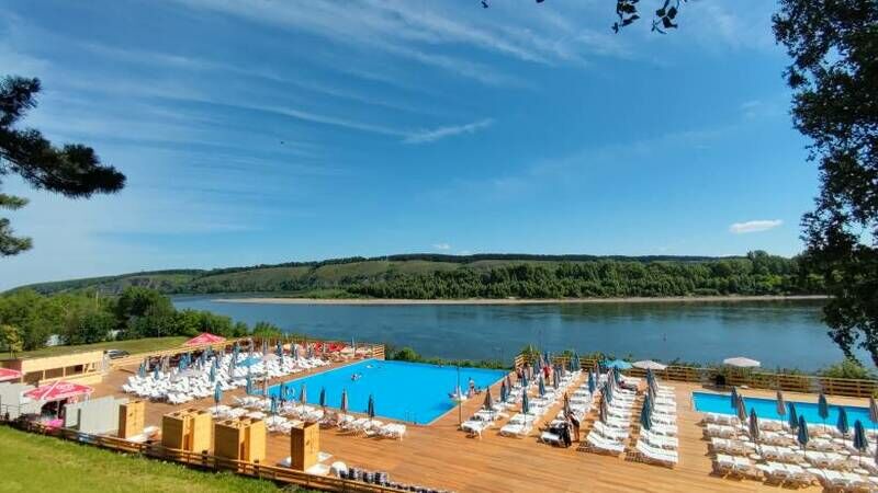 Инфраструктура: лежаки, зонтики, шезлонги, спасательПляж Притомье — огромная терраса на берегу реки с двумя теплыми, подогреваемыми бассейнами — взрослым и детским. Общая площадь возведенной террасы составляет 2000 кв.м.