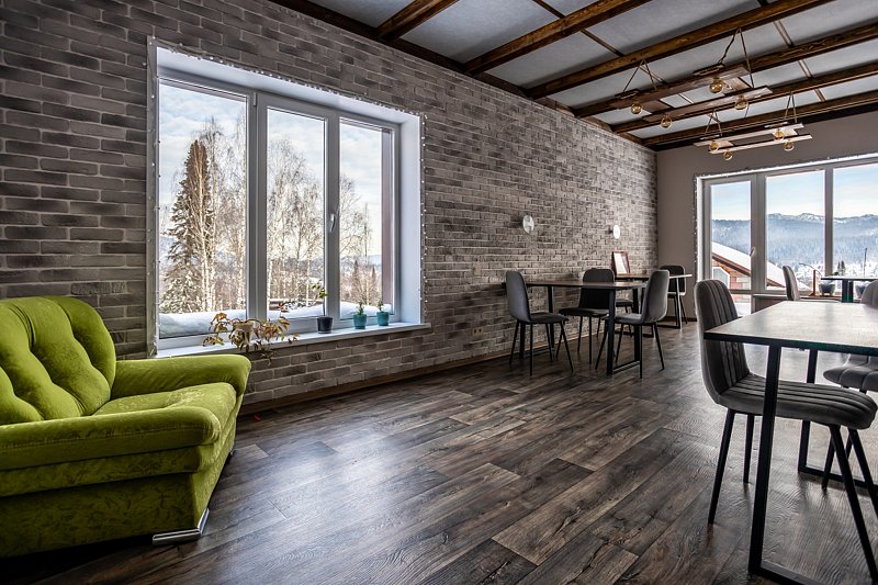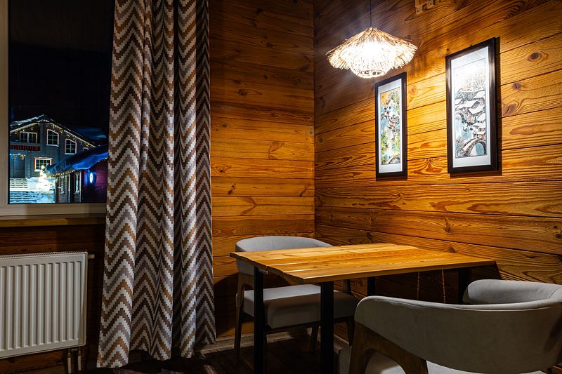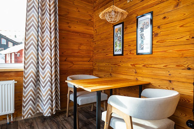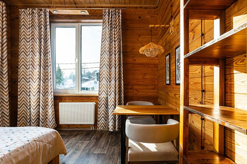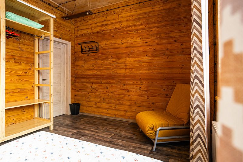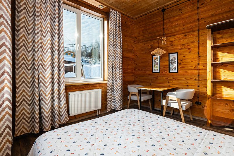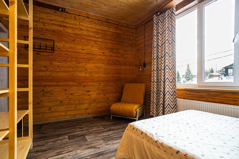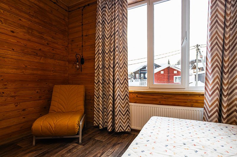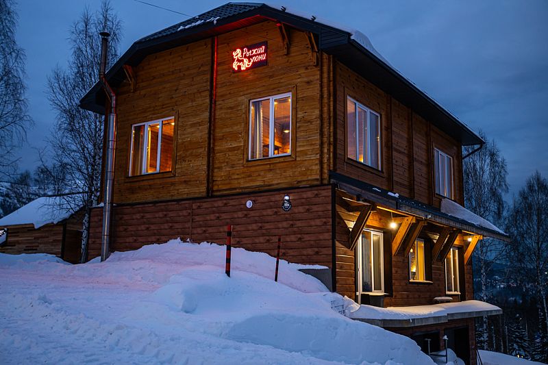 «Рыжий пони» может единовременно принять 10 гостей. Это уютный и очень тёплый дом с собственной системой отопления. На первом этаже и в санузлах есть подогреваемые полы, а горячая вода доступна круглосуточно.