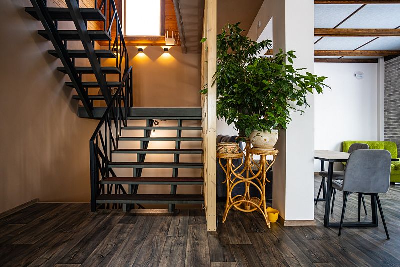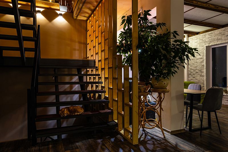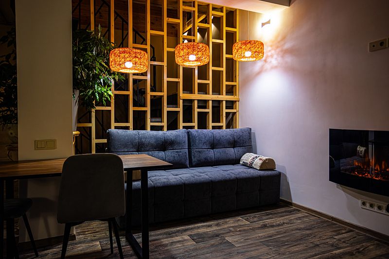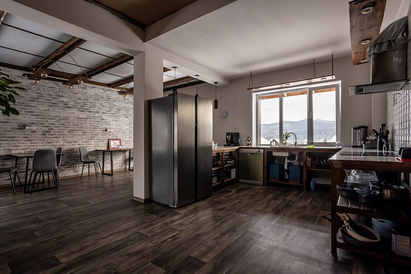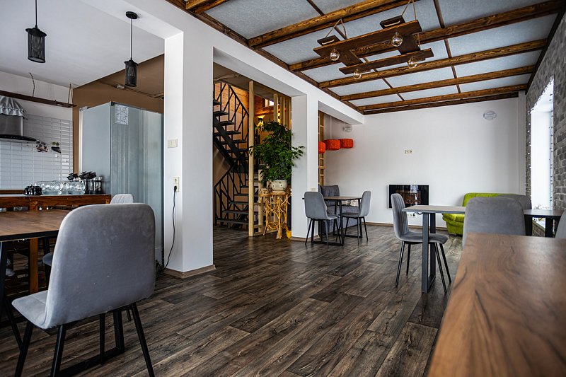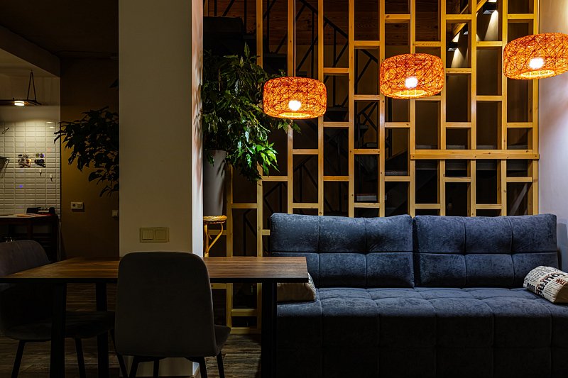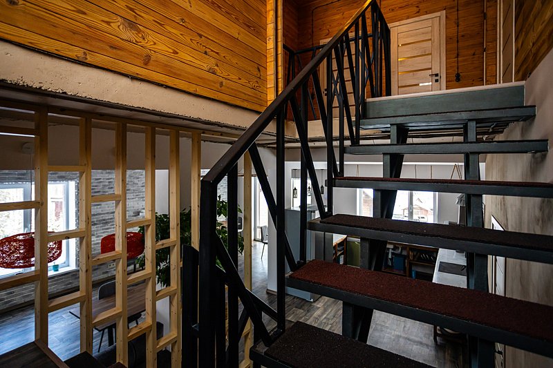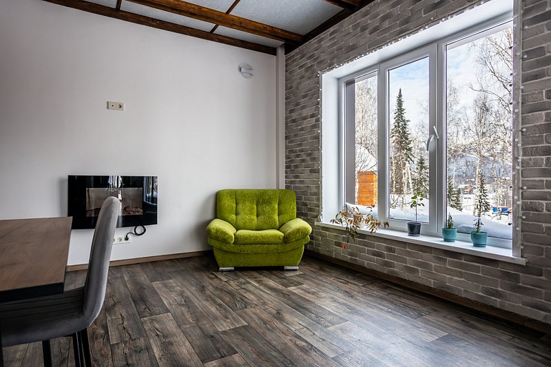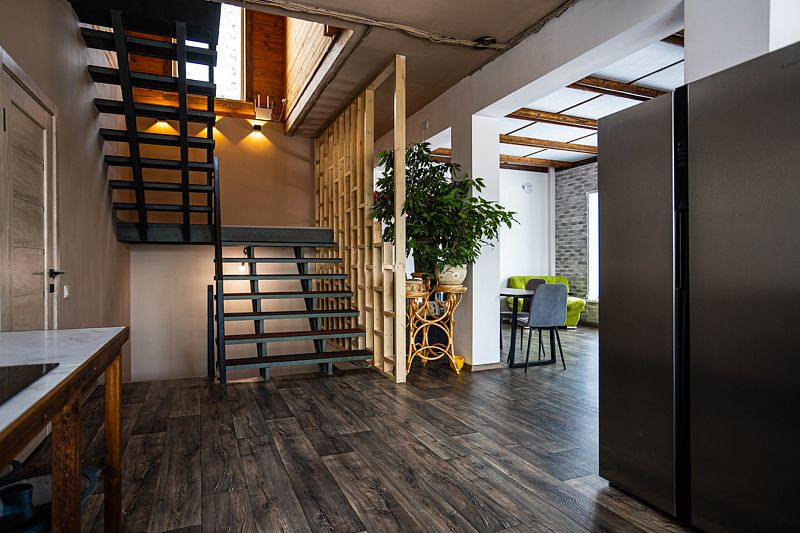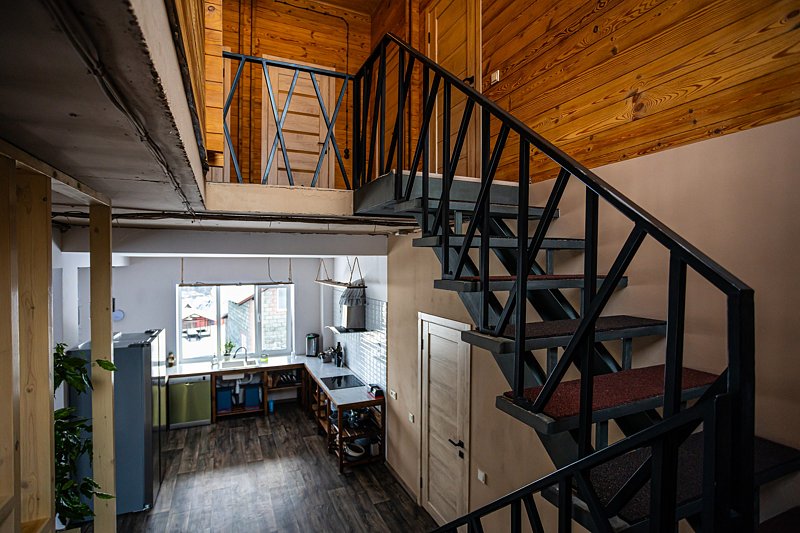 Также на этом же этаже находится просторная гостиная, кухня, организованные в студийном стиле, общей площадью 48 кв.м., и отдельная изолированная комната, где проживают хозяева.