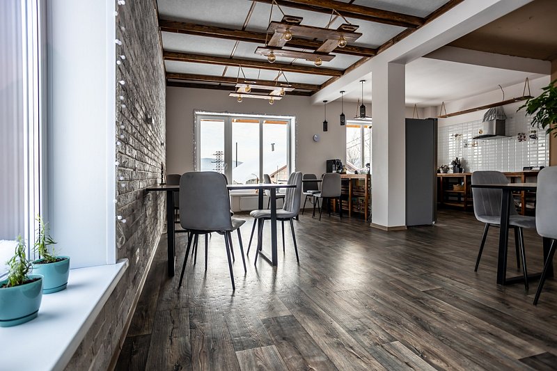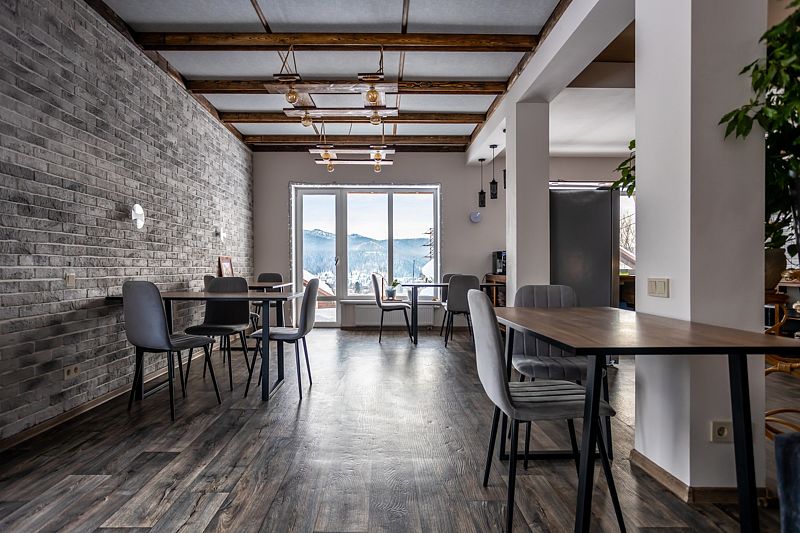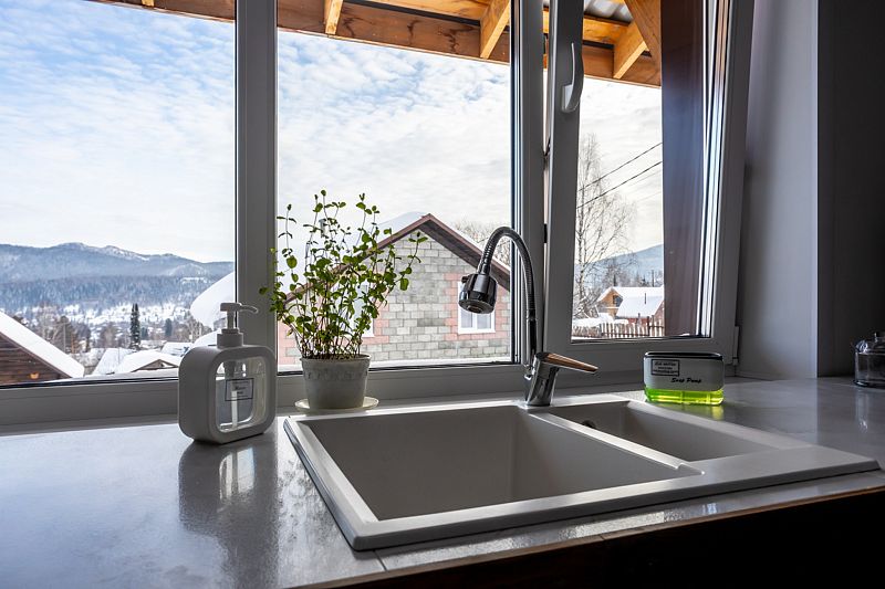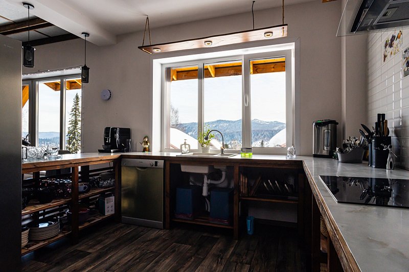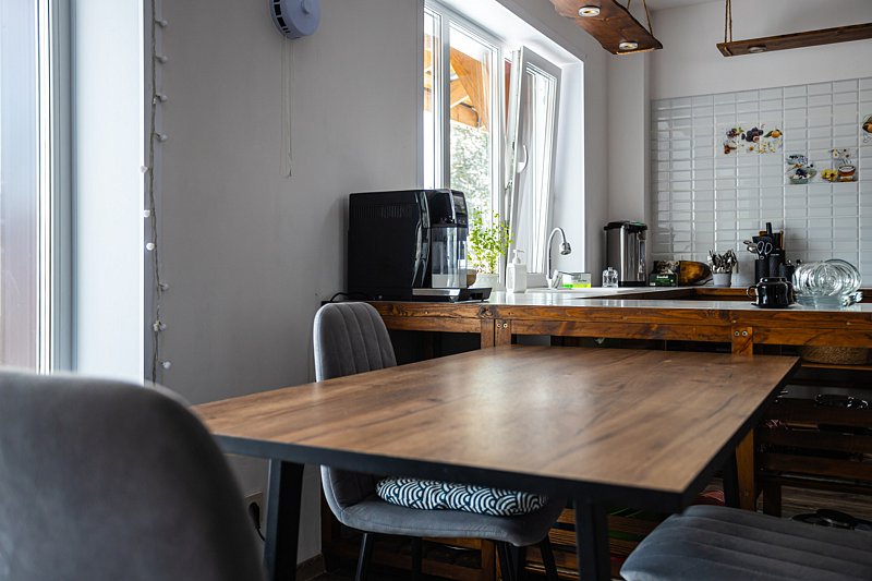 Гости проживают в комнатах, но полноценно пользуются всем имеющимся в доме. К удобству гостей большая гостиная и кухня. На кухне есть все необходимое для приготовления еды, в том числе на большую компанию. Кухонная утварь — кастрюли и сковороды, ножи, столовые приборы, тарелки, кружки, салатники, посуда для спиртных напитков и прочее необходимые предметы для организации ужина компании. Есть вместительный холодильник, плита, посудомоечная машина, электрочайник, микроволновка, кофемашина.