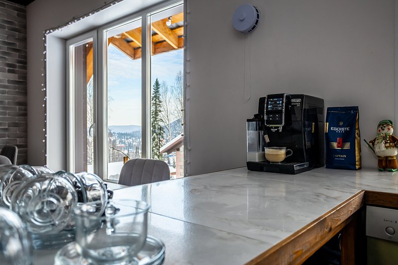К удобству гостей большая гостиная и кухня. На кухне есть все необходимое для приготовления еды, в том числе на большую компанию. Кухонная утварь — кастрюли и сковороды, ножи, столовые приборы, тарелки, кружки, салатники, посуда для спиртных напитков и прочее необходимые предметы для организации ужина компании. Есть вместительный холодильник, плита, посудомоечная машина, электрочайник, микроволновка, кофемашина.