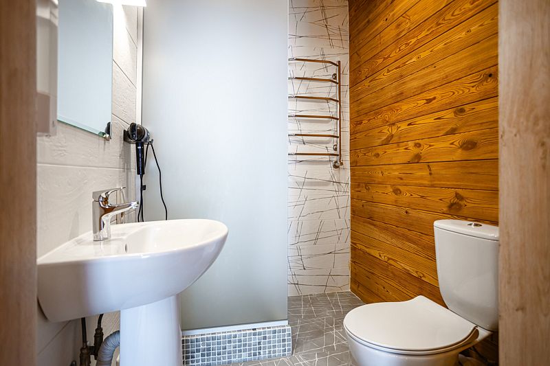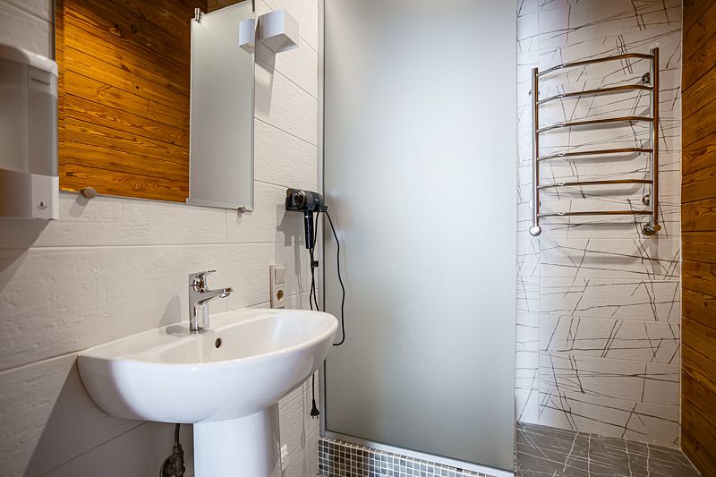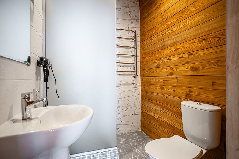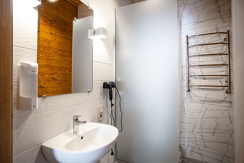 Также гости пользуются двумя туалетными комнатами с душем, гигиенические принадлежности входят в стоимость, есть фен.