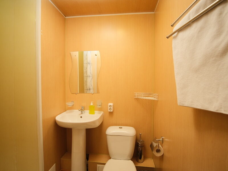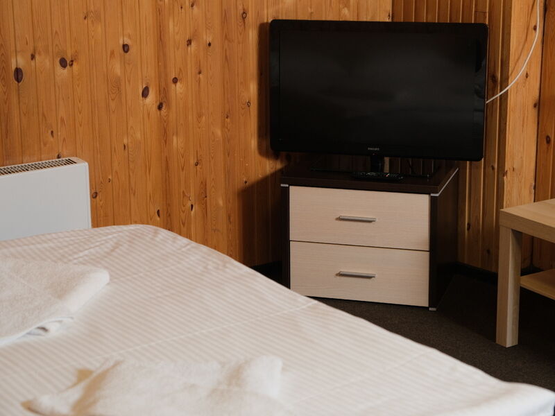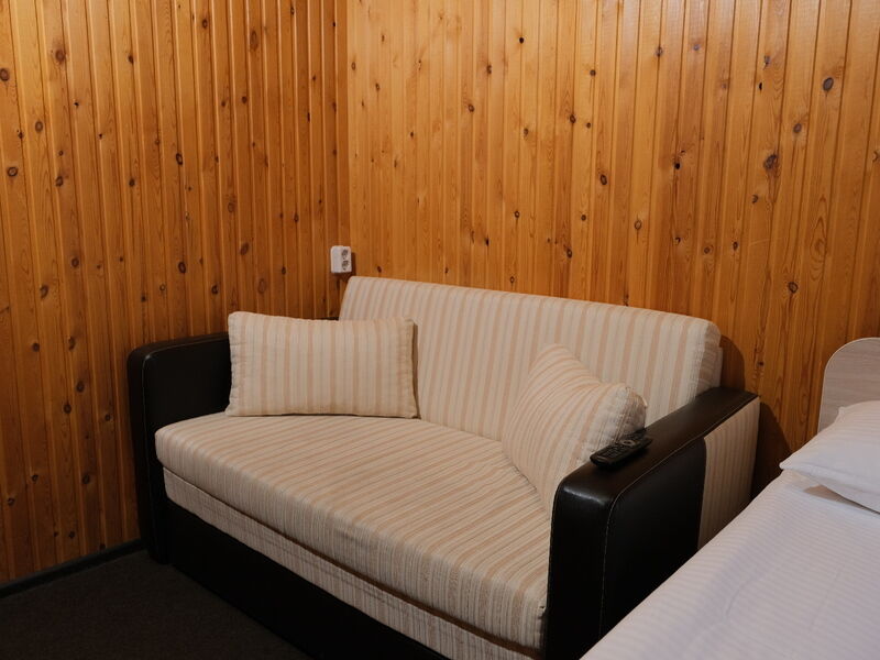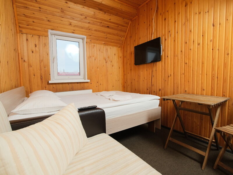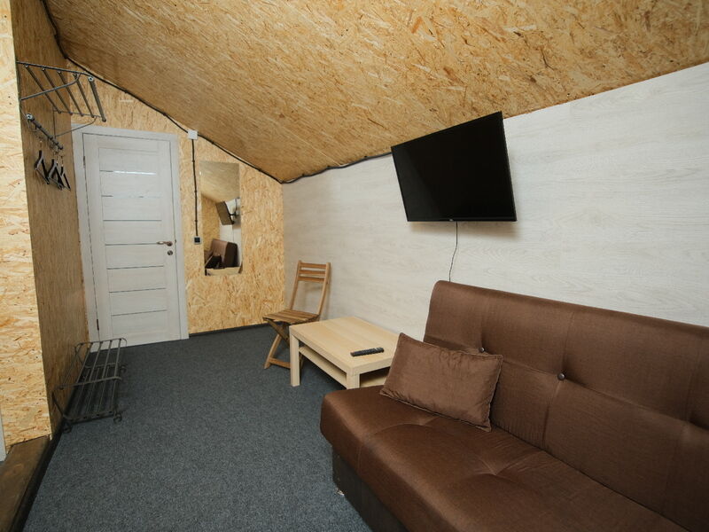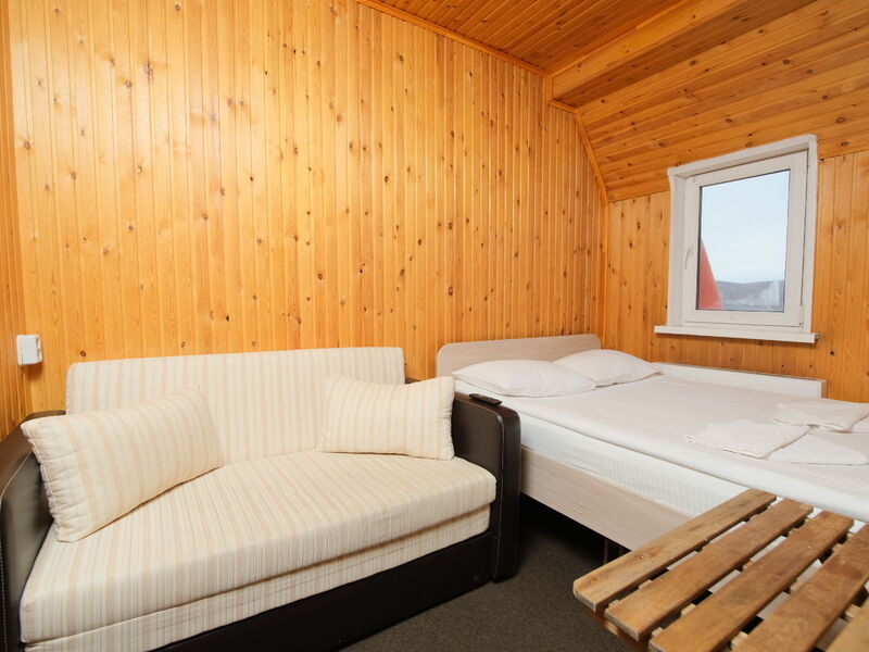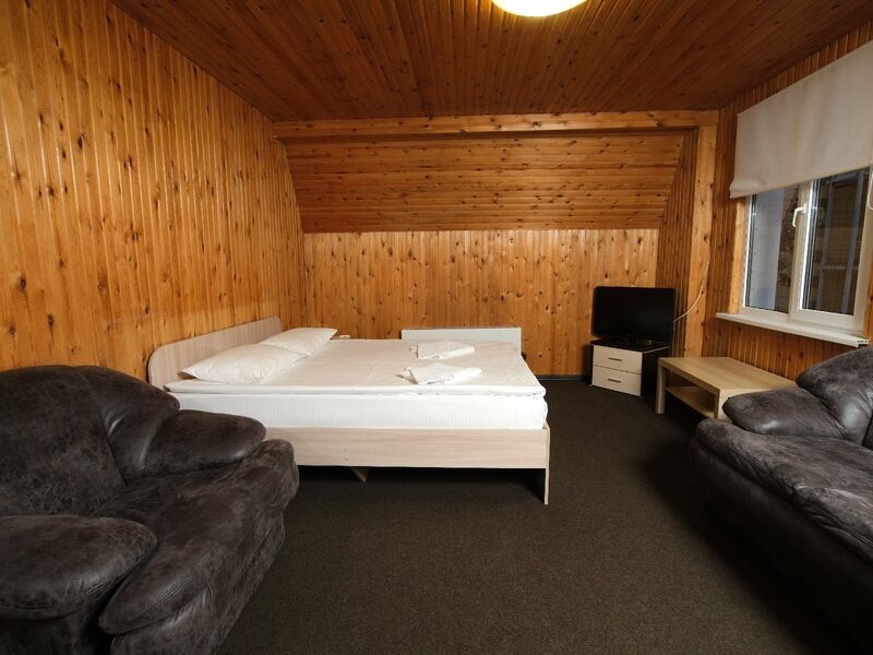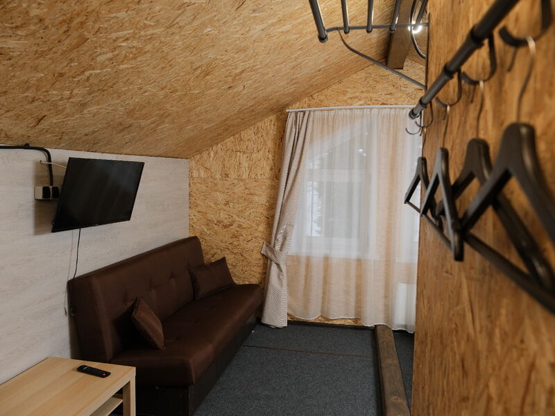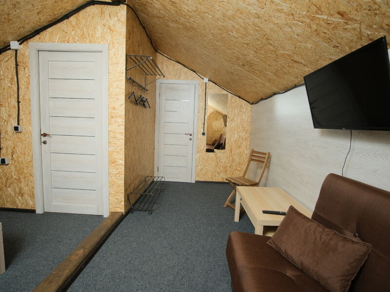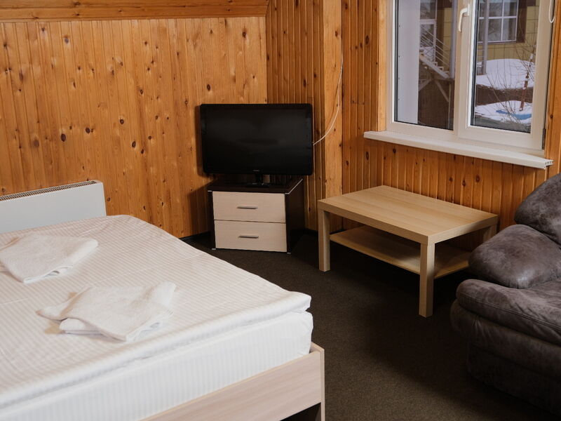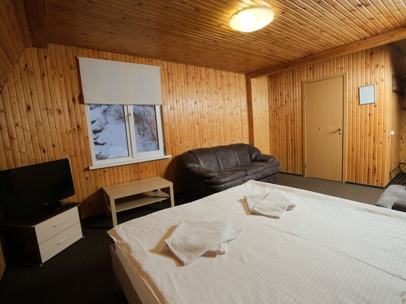 В номере "Комфорт" двуспальная кровать, диван, кресло, шкаф с плечиками, холодильник, обогреватель, телевизор, столик. Обогреватель не включали - и так достаточно тепло. Бывает, вечером горячая вода в душевой недостаточно горячая - дом на бойлере, необходимо подождать. Хорошо ловит wi-fi.