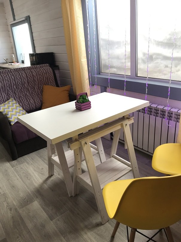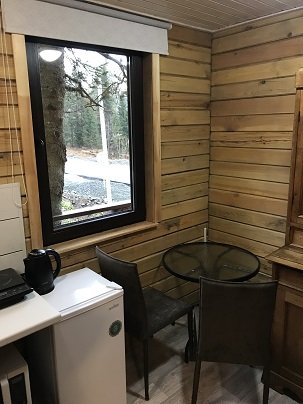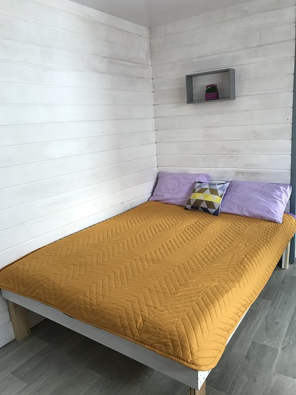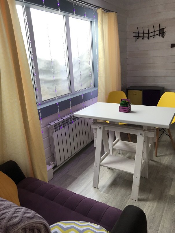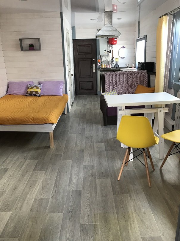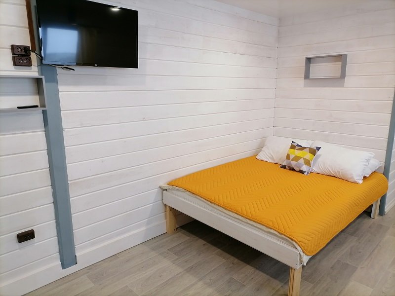 Домик в формате студии. С собственной кухней и санузлом. Расположен прямо у подъемника "ПАНОРАМА", сможете подъехать на лыжах/борде прямо к дверям дома! Спальные места - двуспальная кровать и раскладной диван.В номере