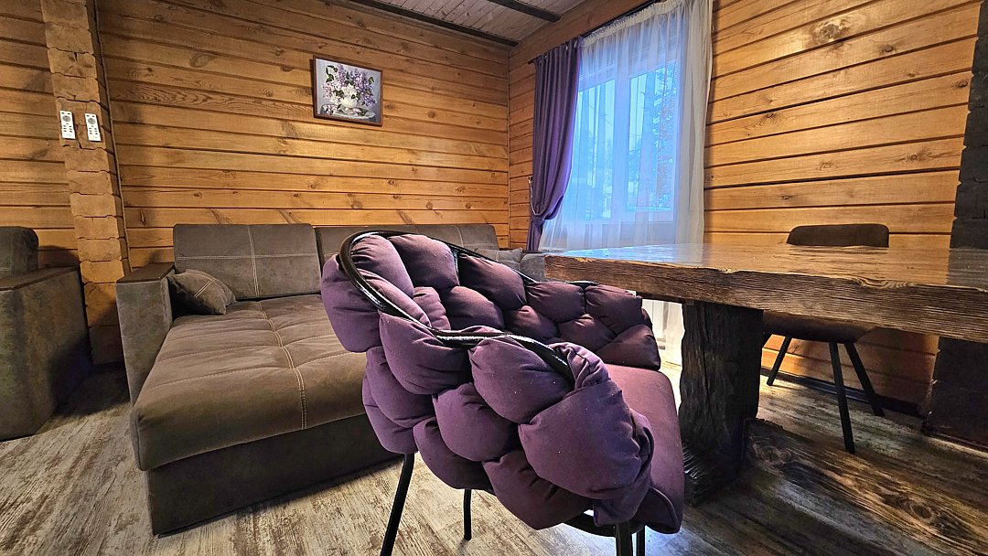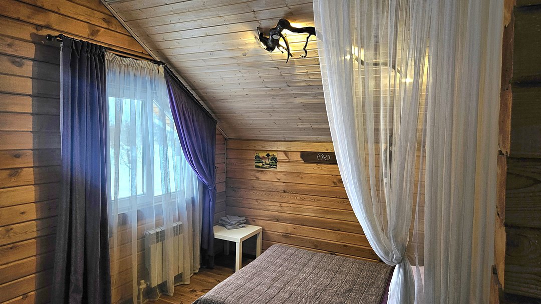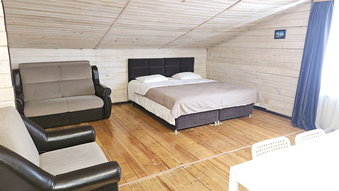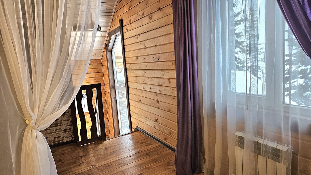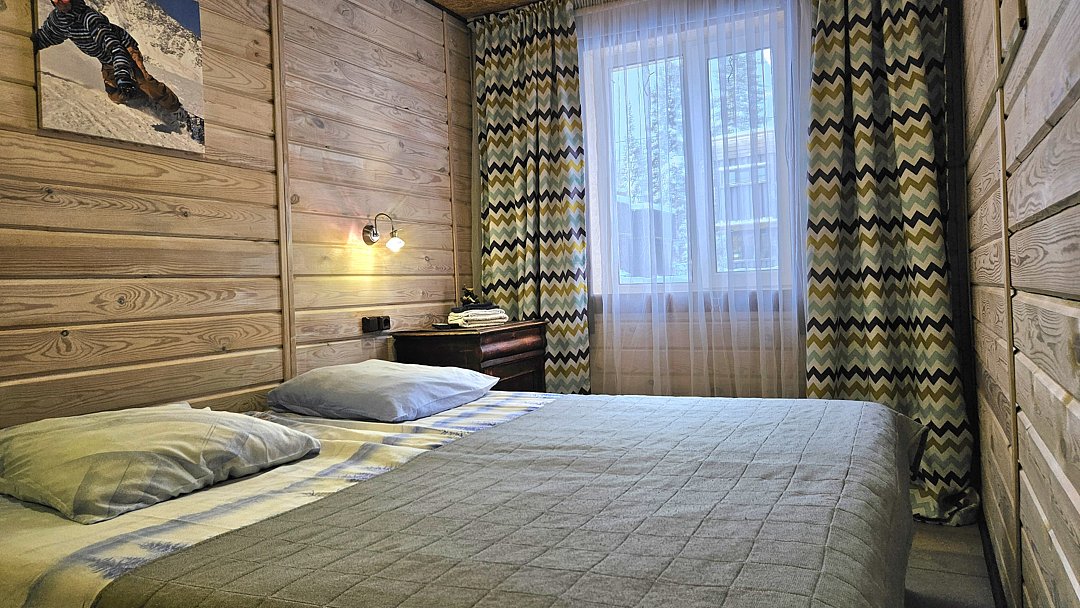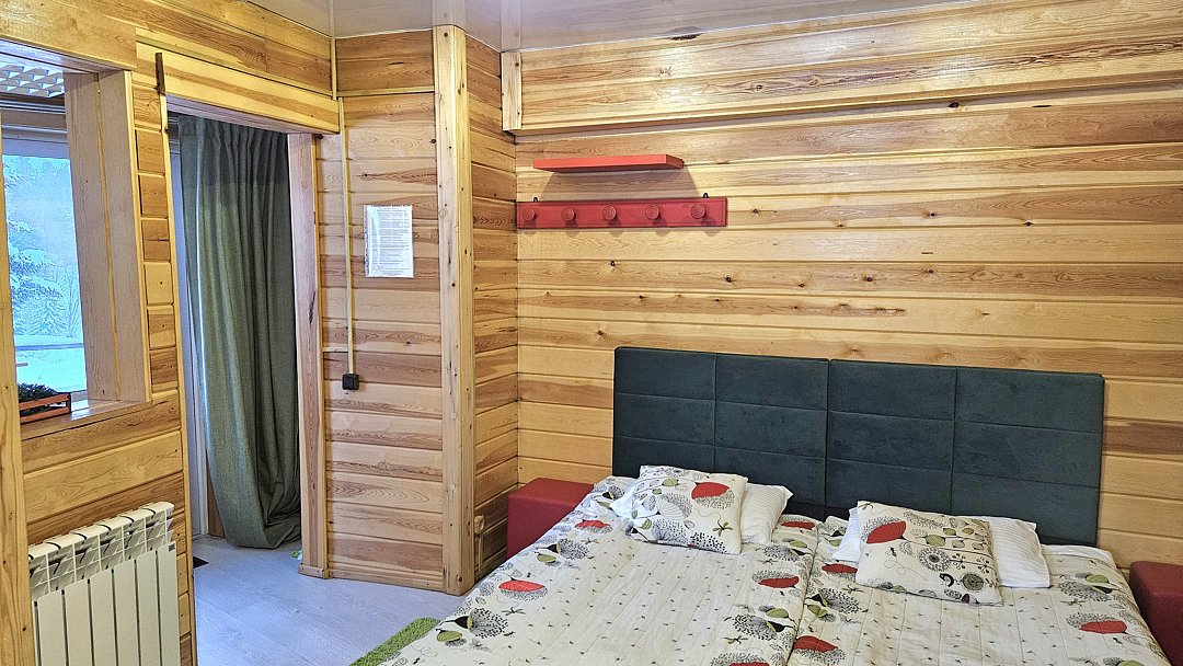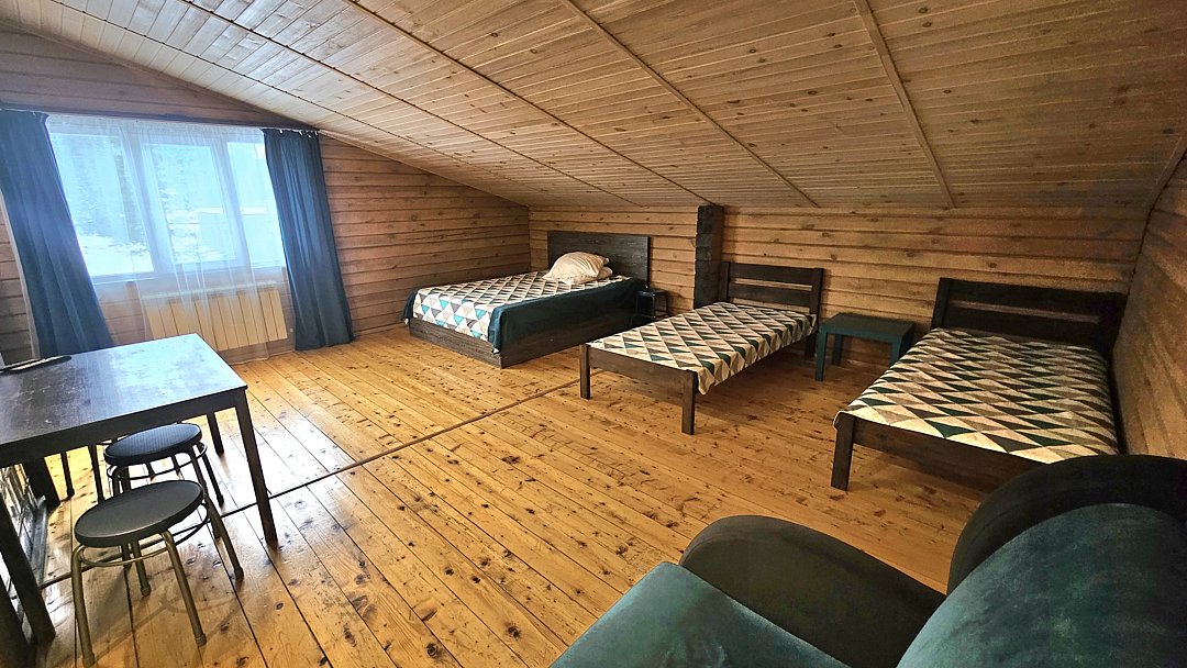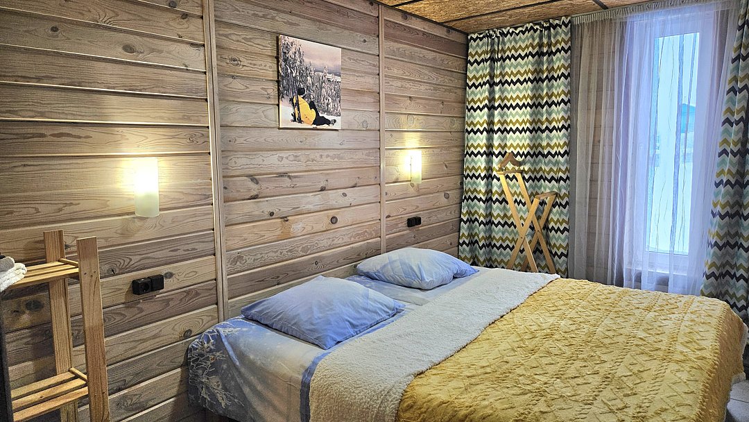 Двухэтажный, отдельно стоящий деревянный дом из бруса. На первом этаже дома в формате студии расположена кухня, обеденная зона, санузел и два раскладывающихся дивана. На втором этаже две изолированные комнаты и одна отгорожена балдахином, везде двуспальные кровати(всего три кровати на втором этаже), так же санузел. Большая парковка, пешая доступность до подъемников Скай Вэй и Подбрасывающего.В номере