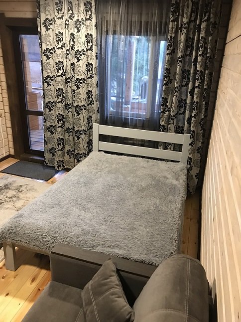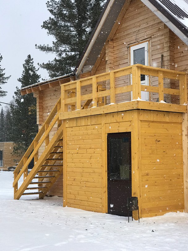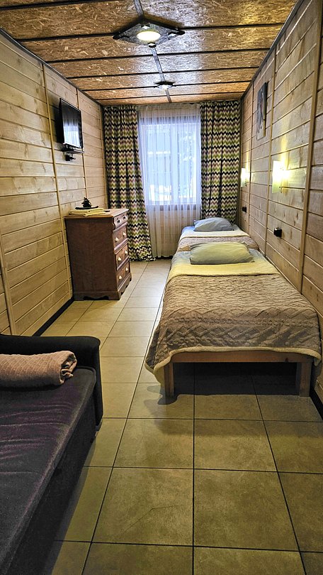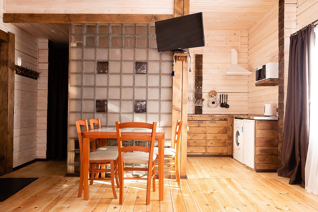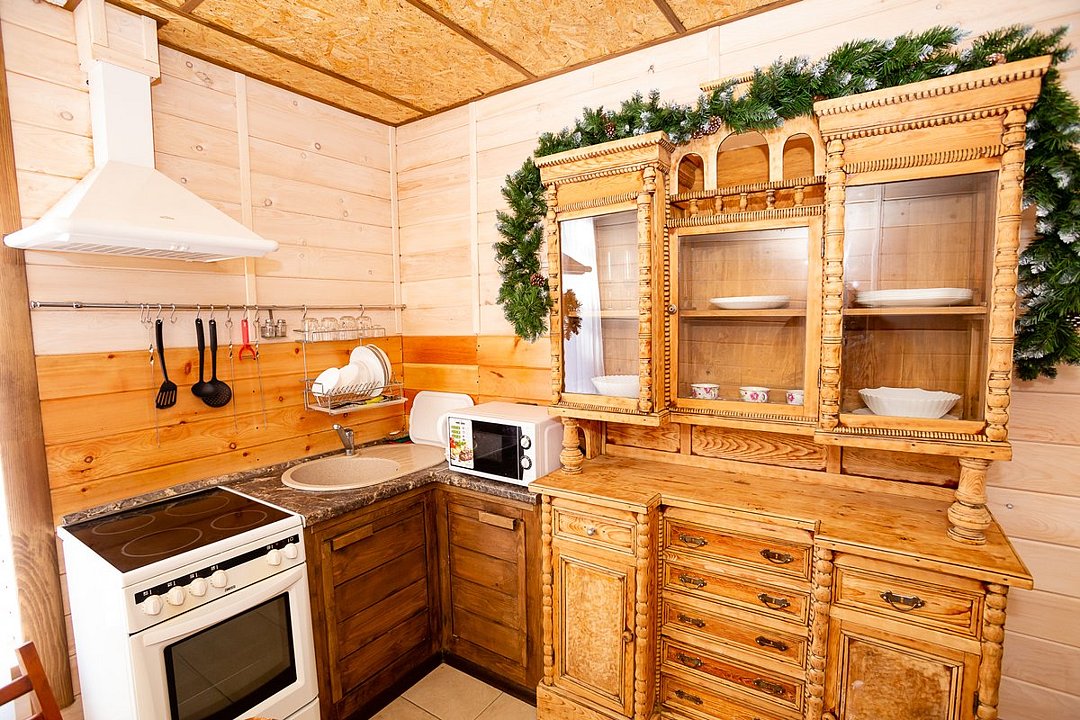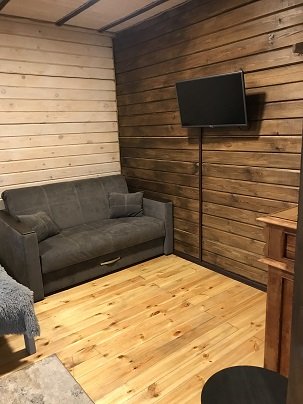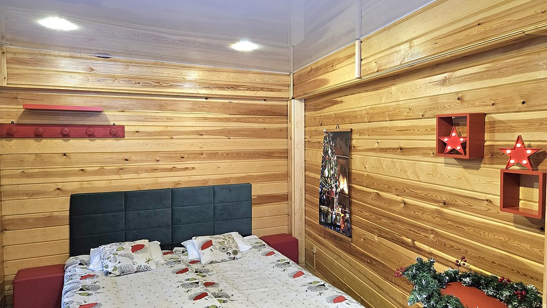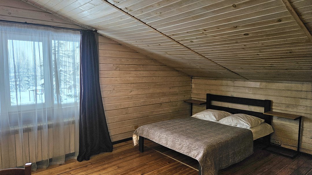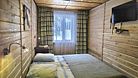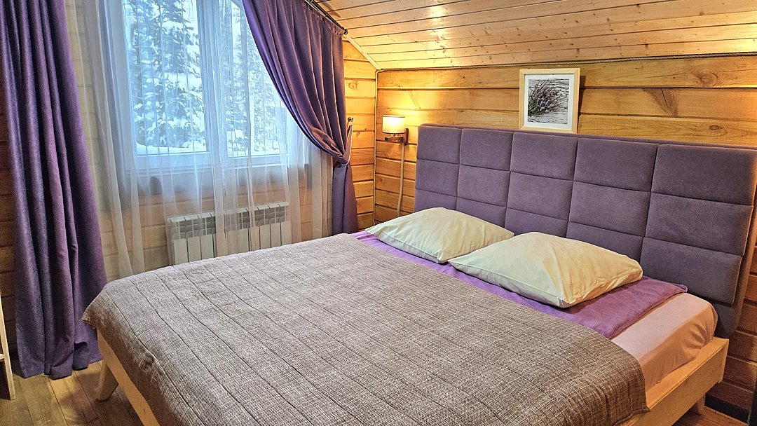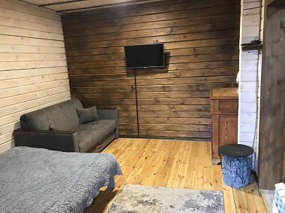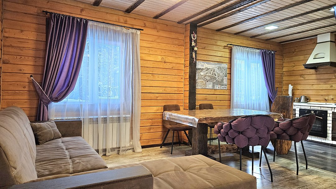 Двухэтажный, отдельно стоящий деревянный дом из бруса. На первом этаже дома в формате студии расположена кухня, обеденная зона, санузел и два раскладывающихся дивана. На втором этаже две изолированные комнаты и одна отгорожена балдахином, везде двуспальные кровати(всего три кровати на втором этаже), так же санузел. Большая парковка, пешая доступность до подъемников Скай Вэй и Подбрасывающего.В номере