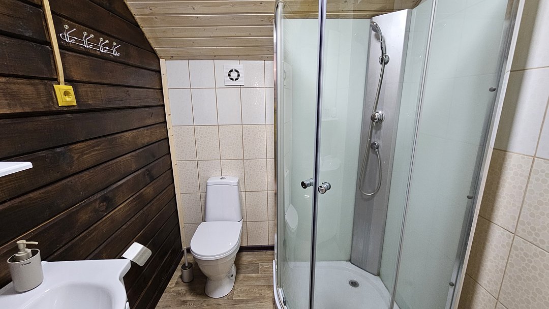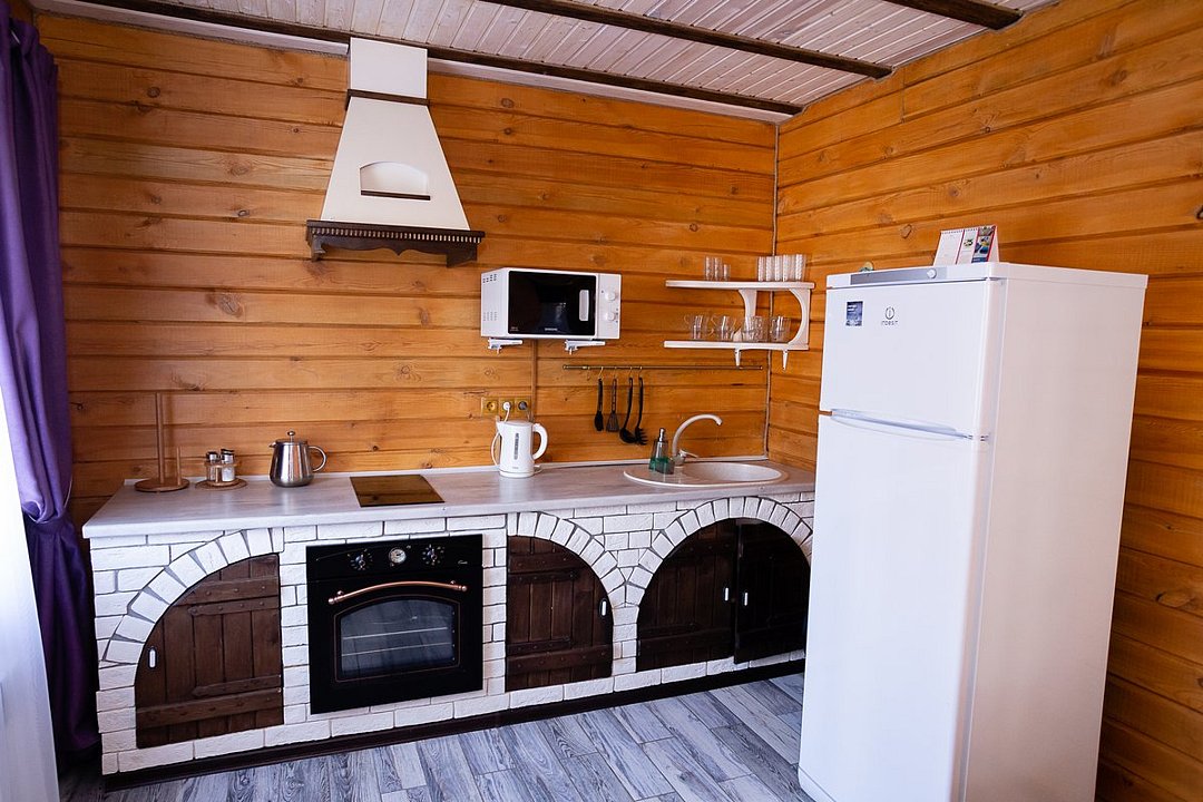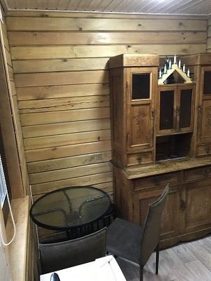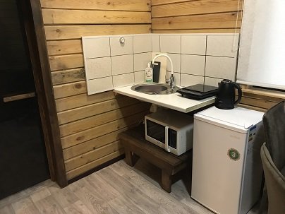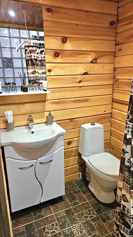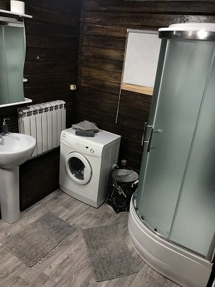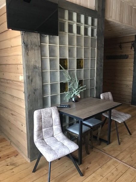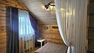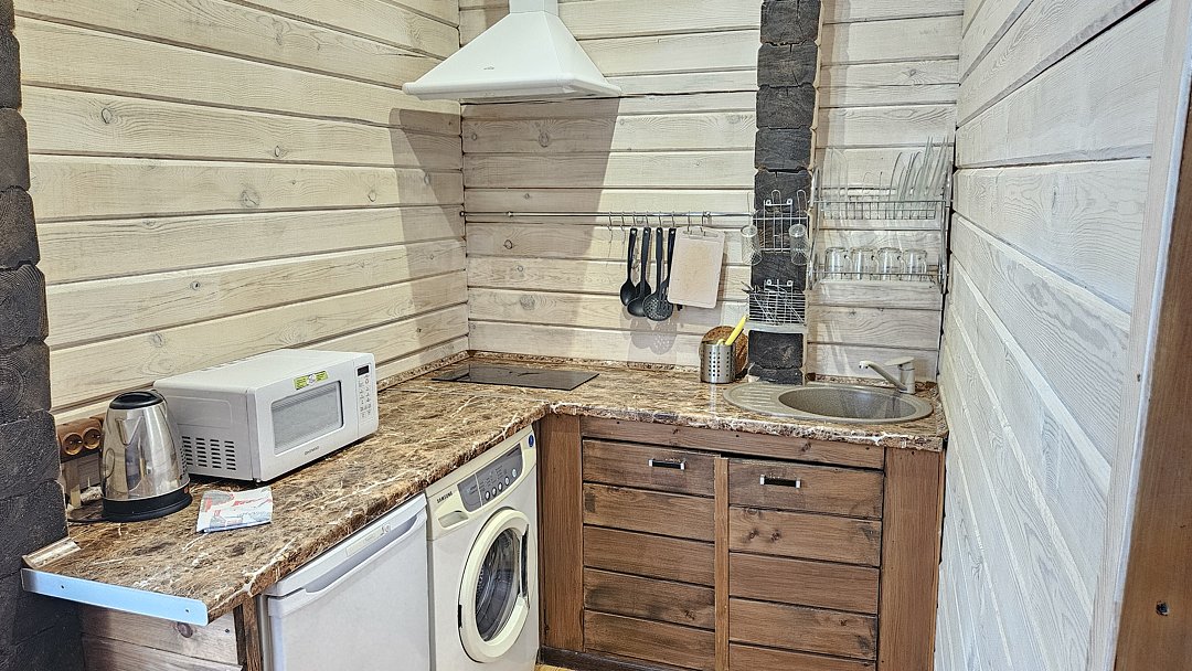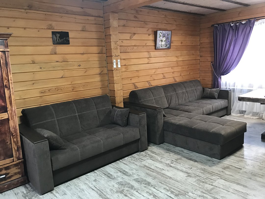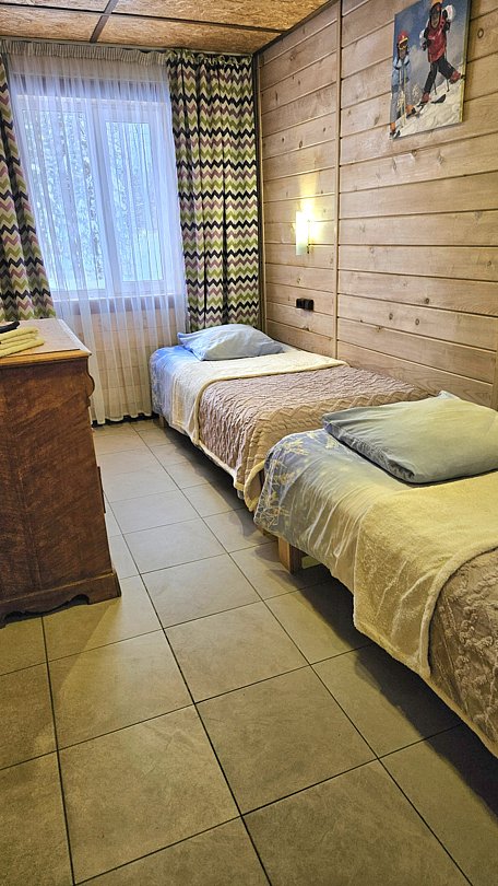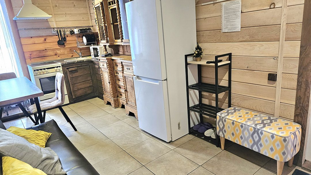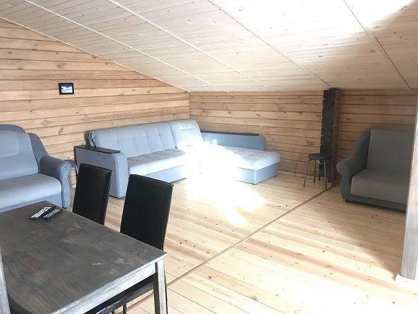 Двухэтажный, отдельно стоящий деревянный дом из бруса. На первом этаже дома в формате студии расположена кухня, обеденная зона, санузел и два раскладывающихся дивана. На втором этаже две изолированные комнаты и одна отгорожена балдахином, везде двуспальные кровати(всего три кровати на втором этаже), так же санузел. Большая парковка, пешая доступность до подъемников Скай Вэй и Подбрасывающего.В номере