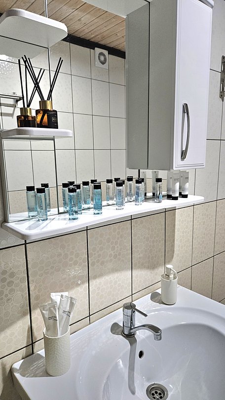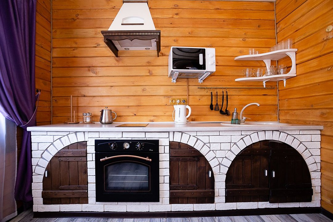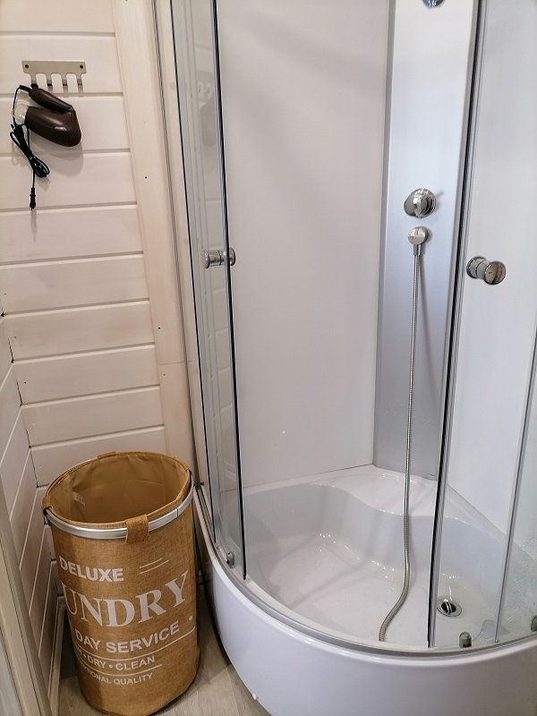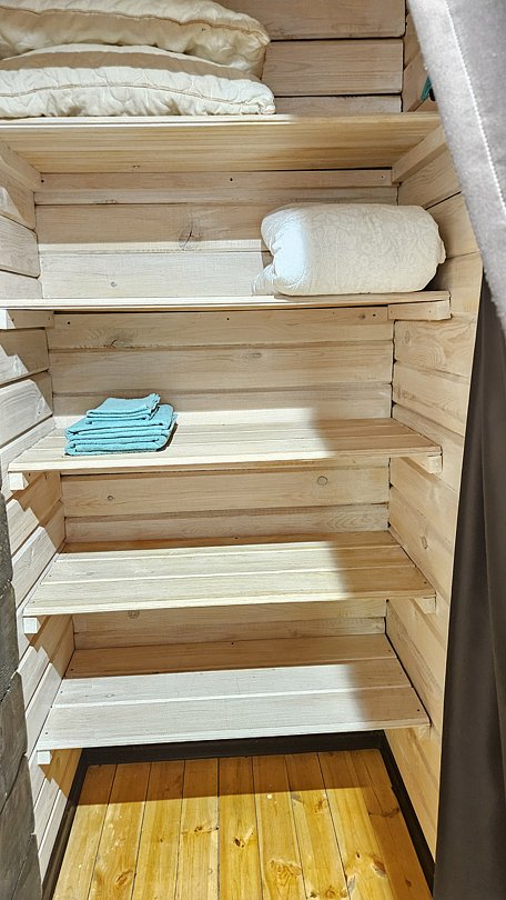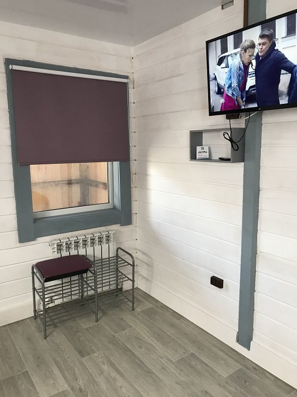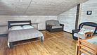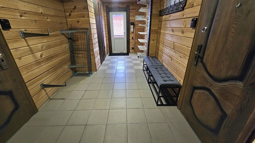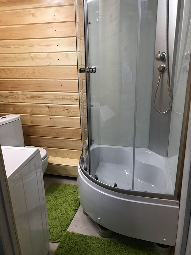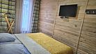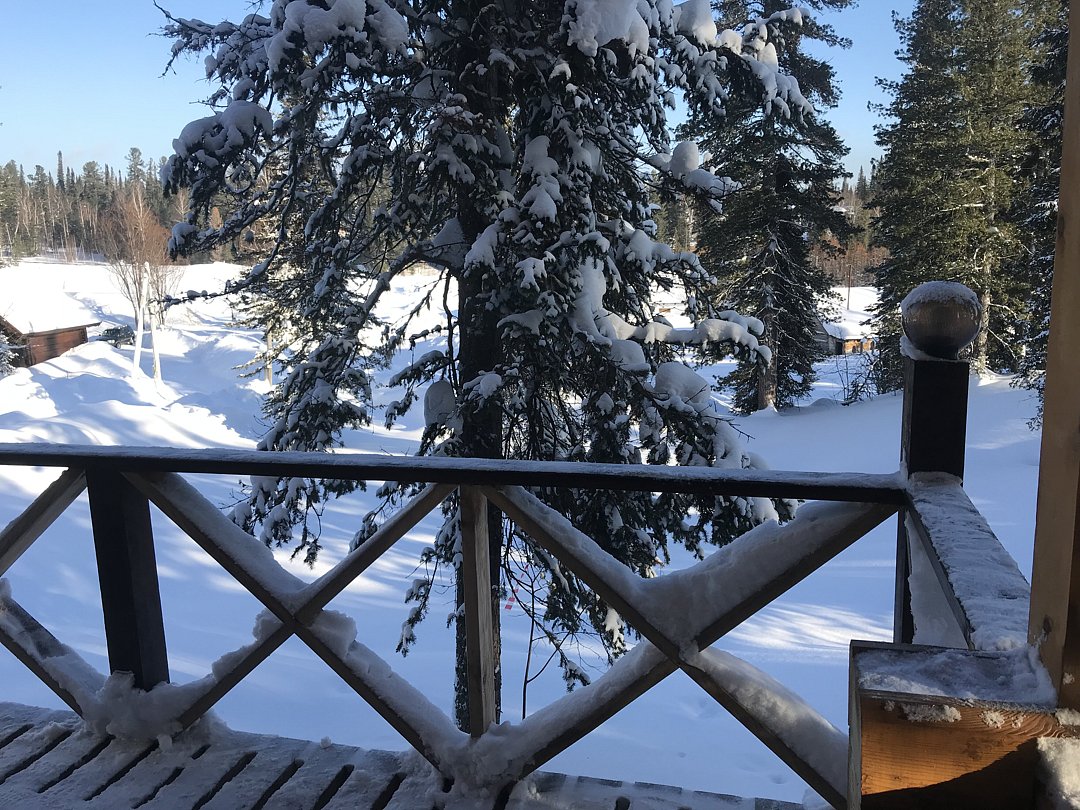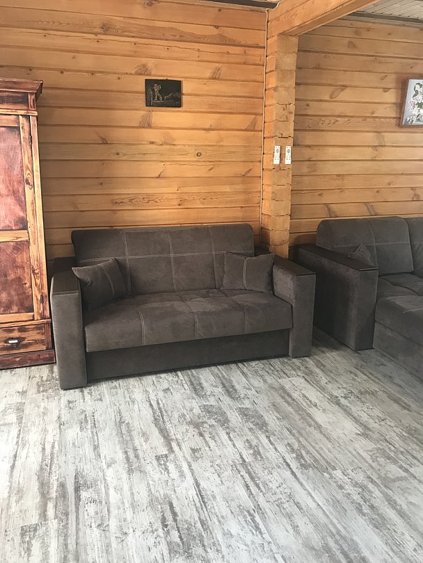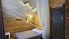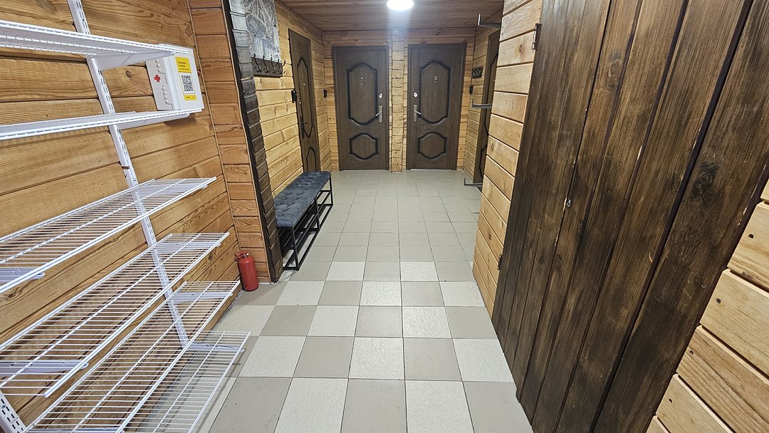 Двухэтажный, отдельно стоящий деревянный дом из бруса. На первом этаже дома в формате студии расположена кухня, обеденная зона, санузел и два раскладывающихся дивана. На втором этаже две изолированные комнаты и одна отгорожена балдахином, везде двуспальные кровати(всего три кровати на втором этаже), так же санузел. Большая парковка, пешая доступность до подъемников Скай Вэй и Подбрасывающего.В номере
