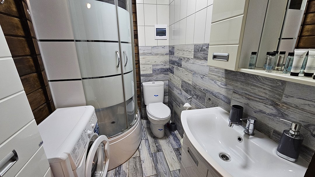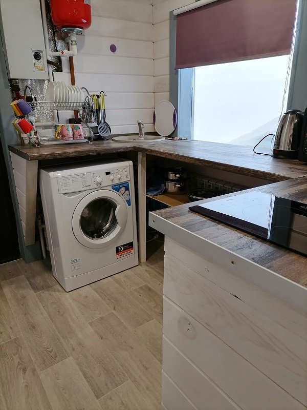 Номер-студия с собственным санузлом и кухней Спальные места: кровать, раскладной диван, раскладное кресло либо Два раскладных дивана и раскладное кресло В номере: плита; -СВЧ; -электрочайник; -холодильник; стиральная машина; -фен; -ТВ. Большая парковка, пешая доступность до подъемников Скай Вэй и Подбрасывающего.В номере