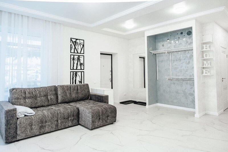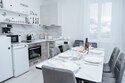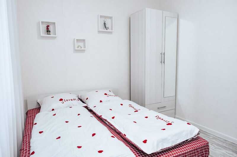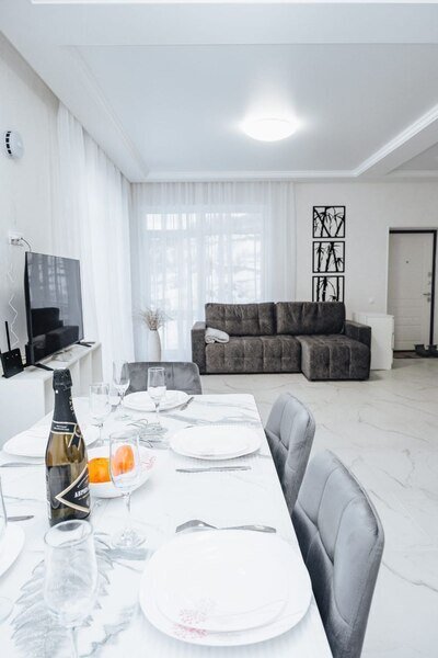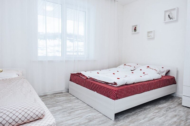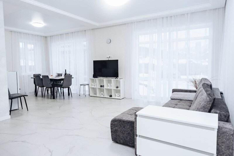 Светлые тона интерьера и удобная планировка создают комфортную атмосферу для отдыха. В доме имеются две спальни, кухня-гостиная и просторная ванная комната. Гости могут воспользоваться телевизором, феном, стиральной машиной и получить комплект полотенец.