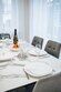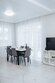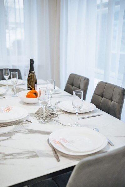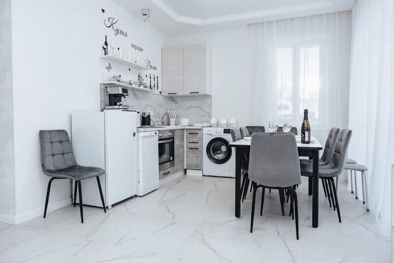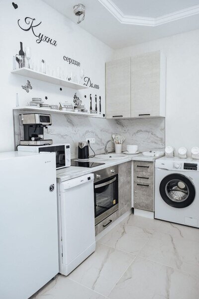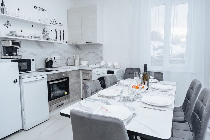 Кухня оснащена современной бытовой техникой: холодильником, плитой, чайником, микроволновой печью, а также набором посуды и обеденным столом.