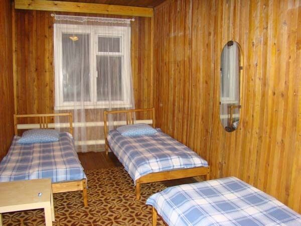 В номере: три односпальных кровати, небольшой столик, зеркало.