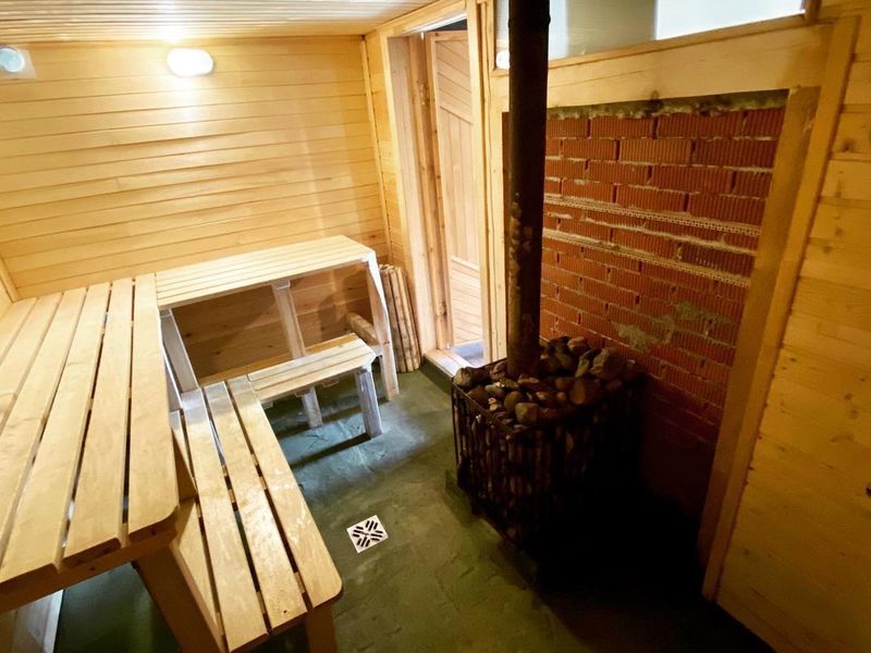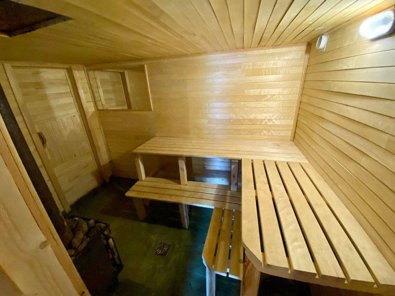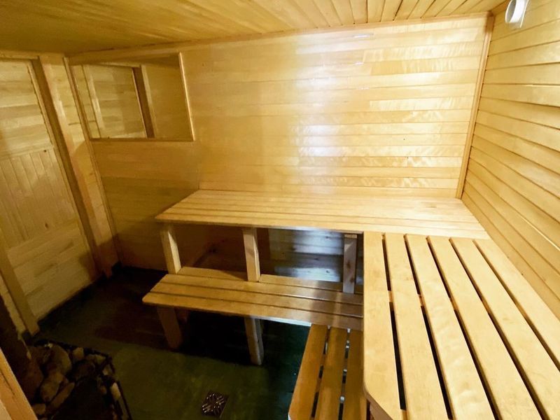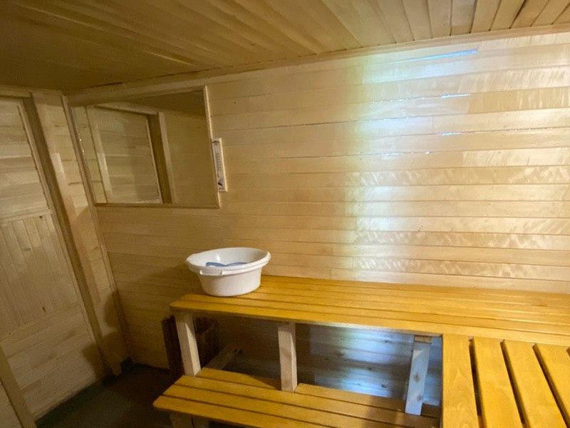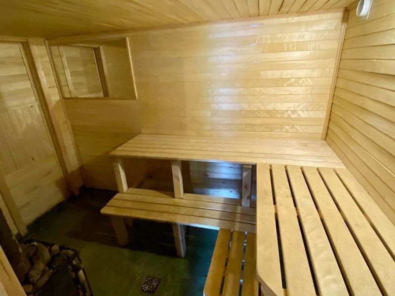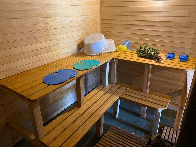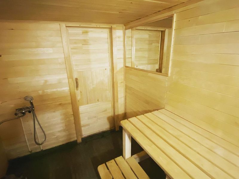 Парная находится в доме. Парная с полка́ми 2 уровней, ручным душем и краном с холодной и горячей водой.
