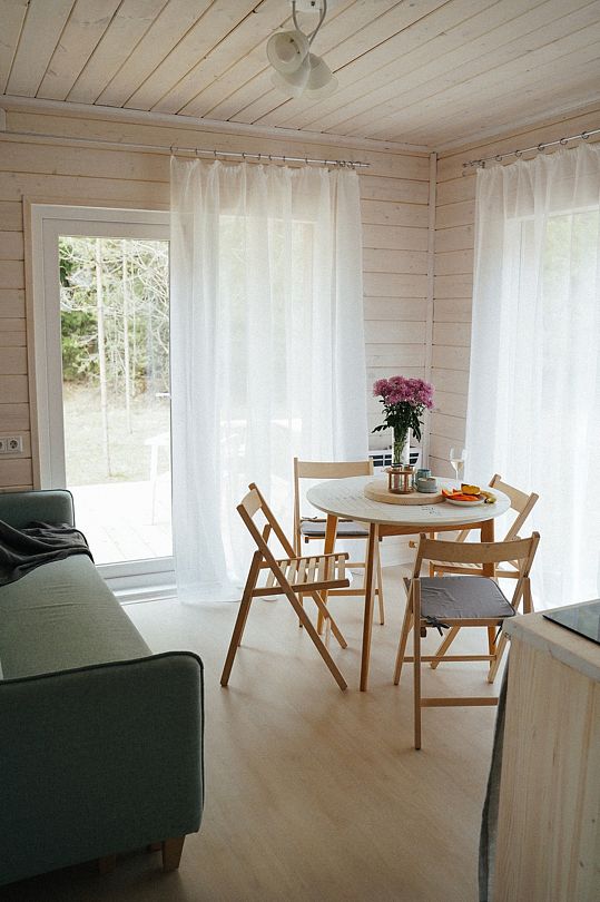 Дом рассчитан на четверых человек. В вашем распоряжении все необходимое: стол, стулья, холодильник, чайник, раковина, плита, набор посуды, электричество, двуспальная кровать, диван, спальные принадлежности, туалетные принадлежности, душ и костровище.
