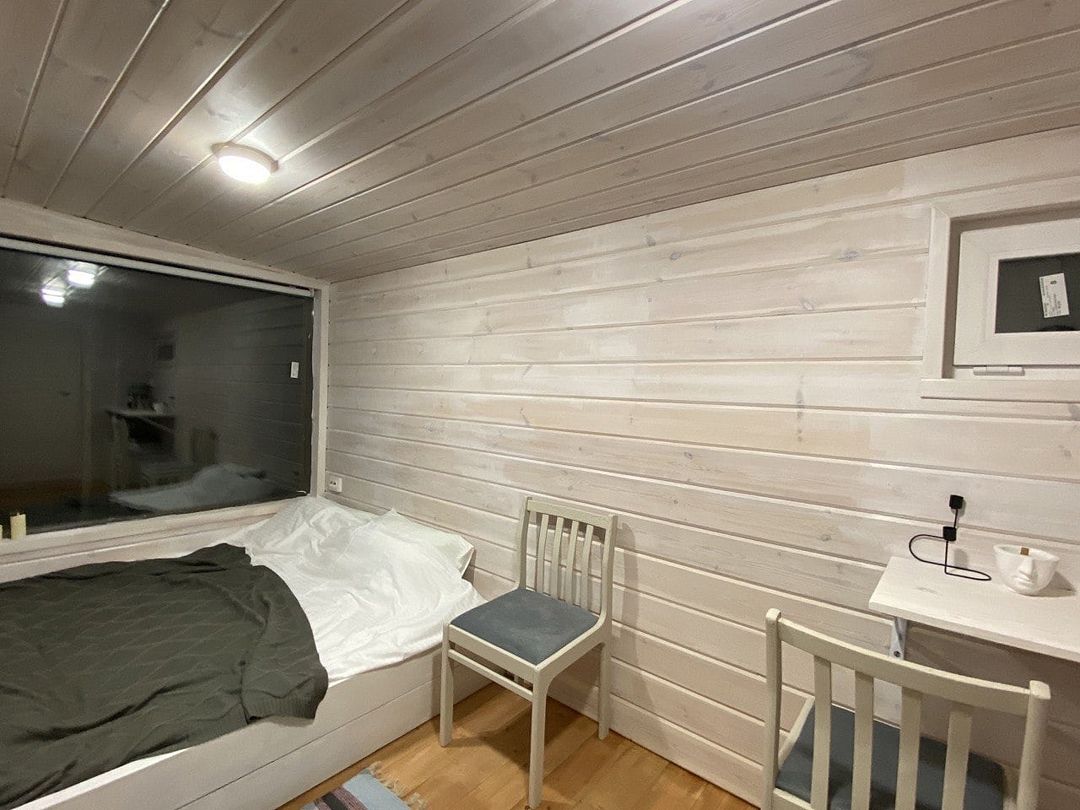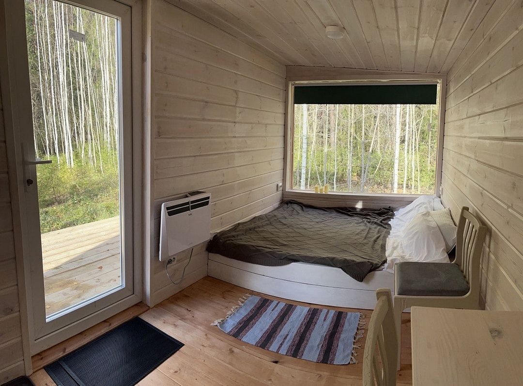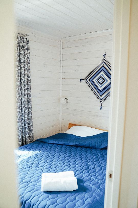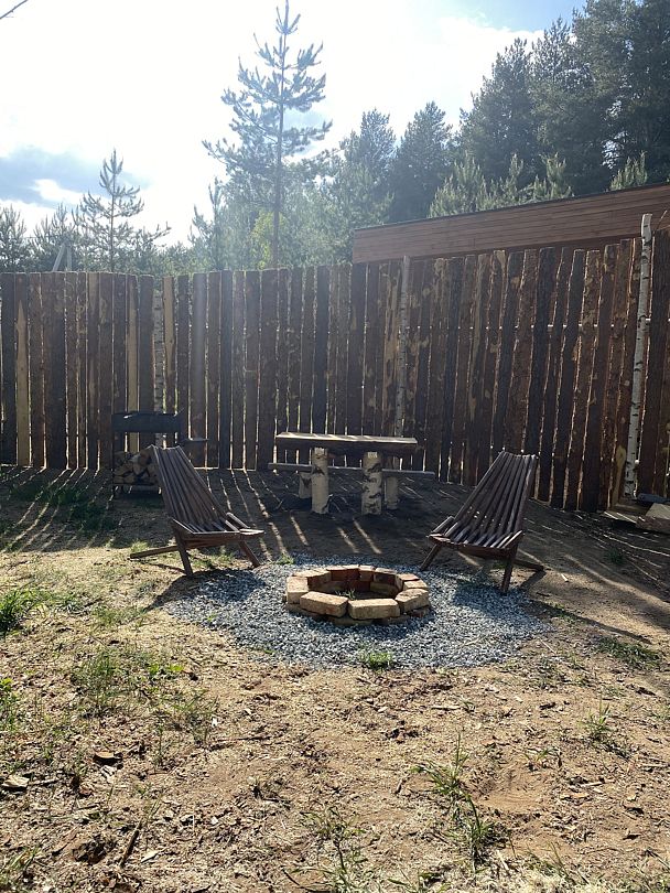 Дом рассчитан на двоих. В вашем распоряжении все необходимое: стол, стулья, холодильник, чайник, раковина, плита, набор посуды, электричество, двуспальная кровать, спальные принадлежности, туалетные принадлежности, душ и костровище.