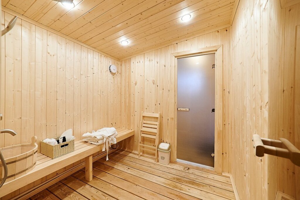 Инфраструктура: тапочки, чан, полотенца, дубовые веники -