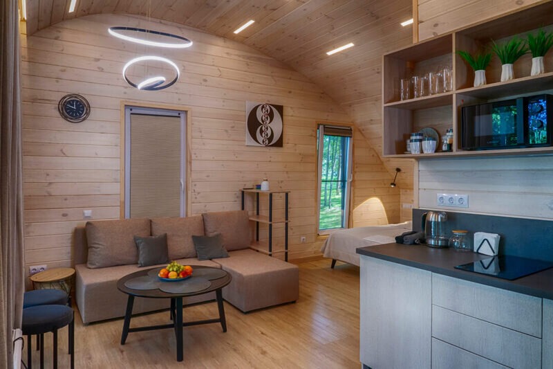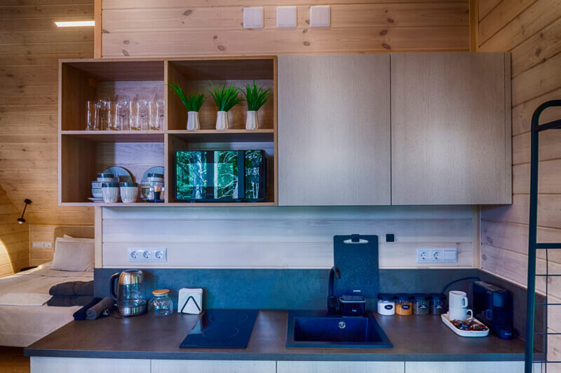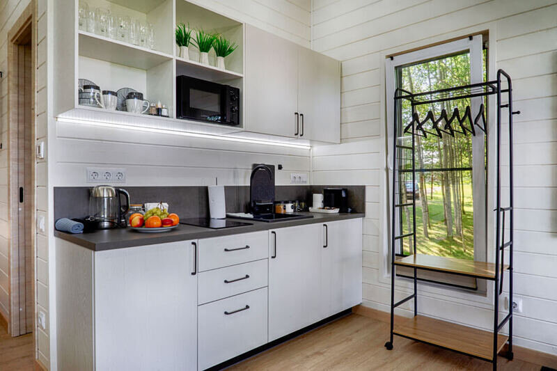 - В гостевых домах Sfera 9.1 и Sfera 9.2 имеются полноценные уютные и просторные кухни оборудованные всем необходимым для самостоятельного приготовления еды. Вам обязательно придется по душе стильный дизайн и продуманный функционал кухонь.
