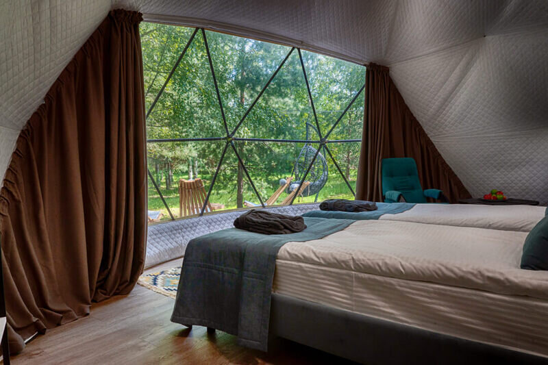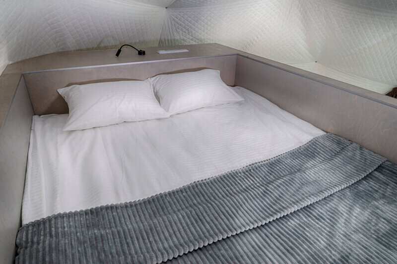 Просторный утепленный шатер премиум класса для круглогодичного проживания с двумя кроватями, которые можно совместить в одну широкую и большим двуспальным местом на втором ярусе.
