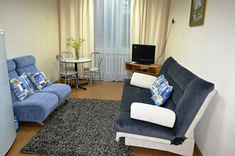 Мягкая мебель, 2-спальная кровать, 2 тумбочки, шкаф для посуды, телевизор, холодильник, посуда, микроволновая печь.
