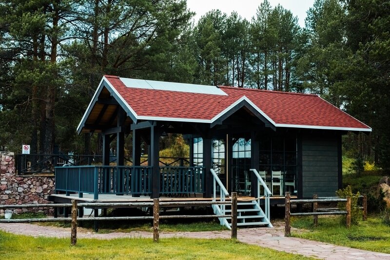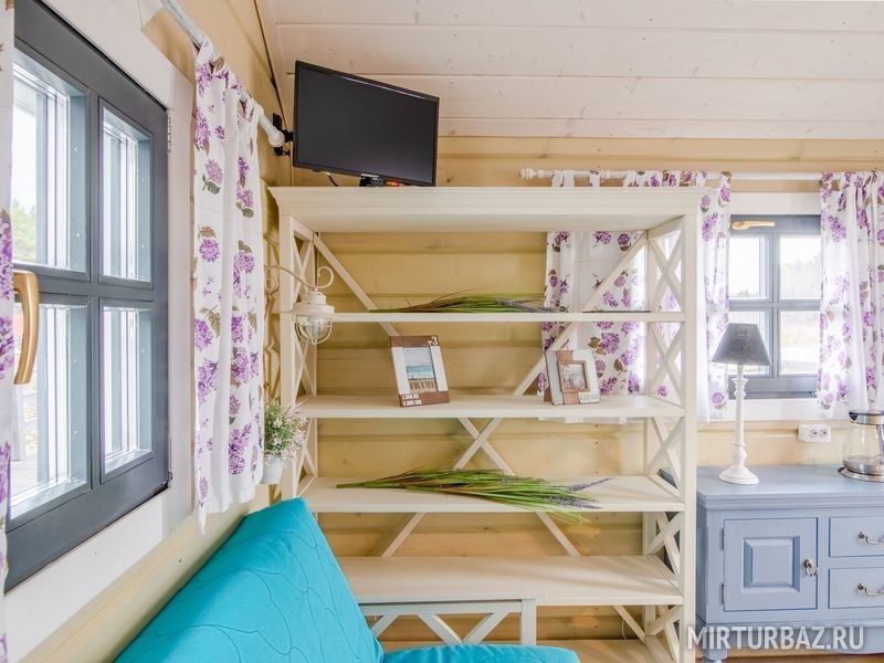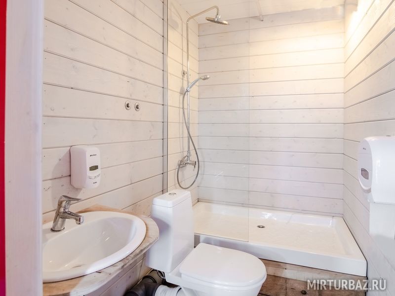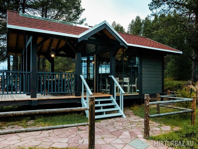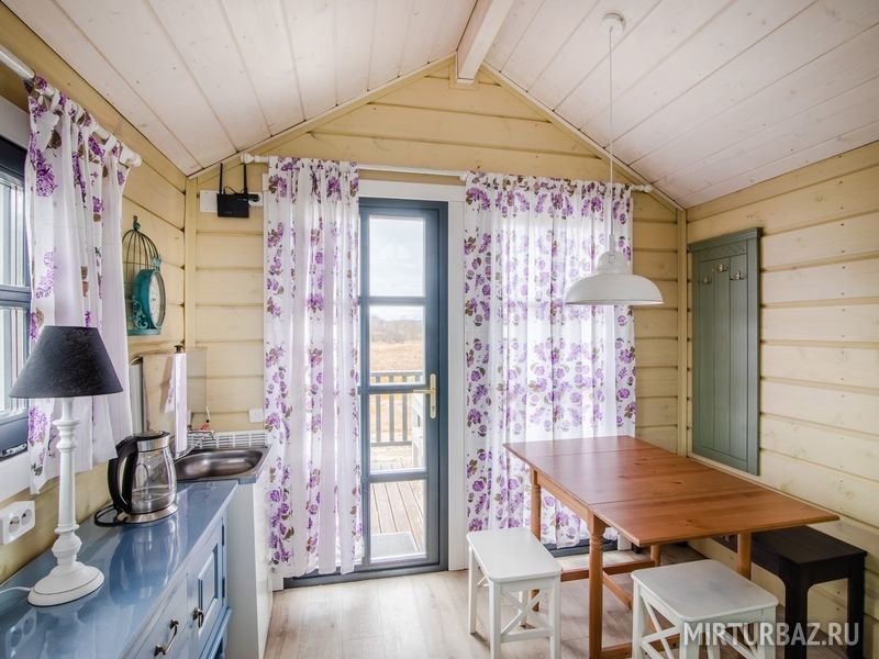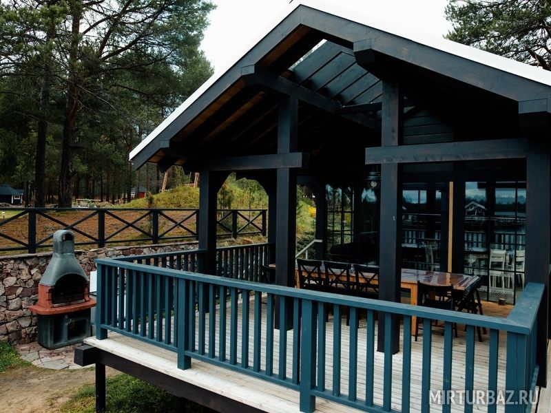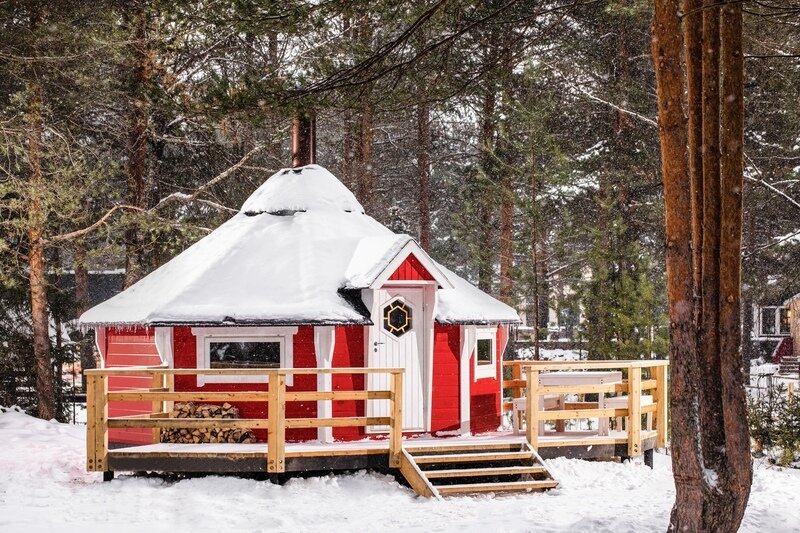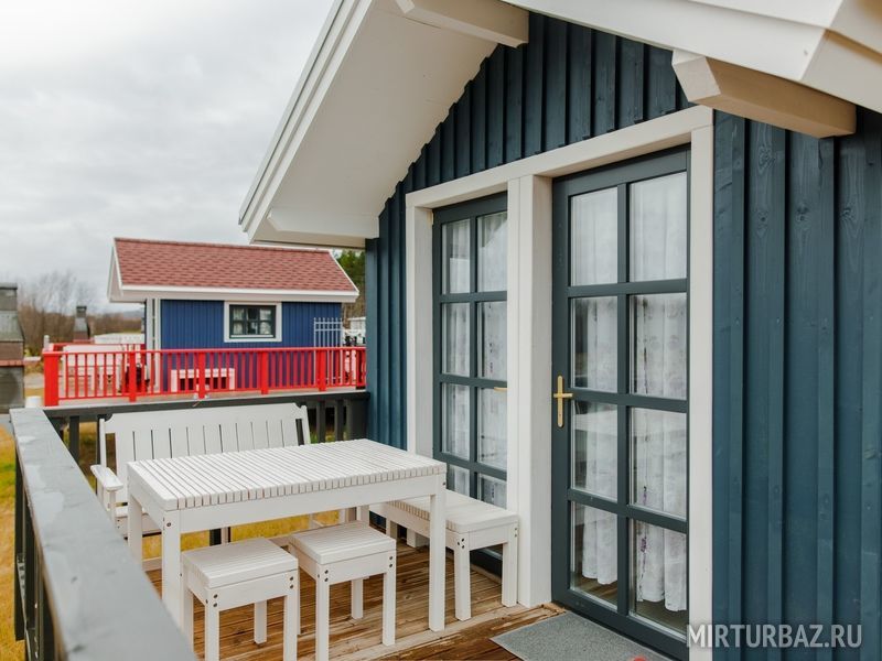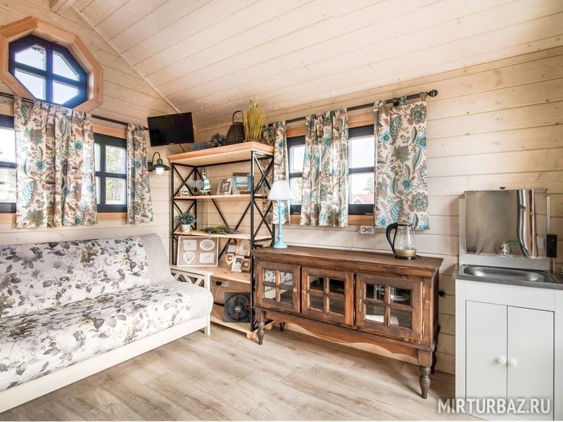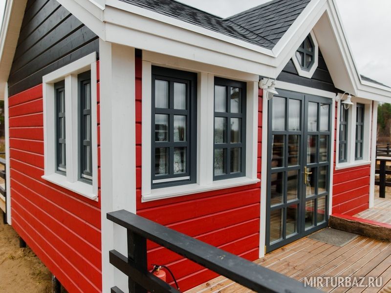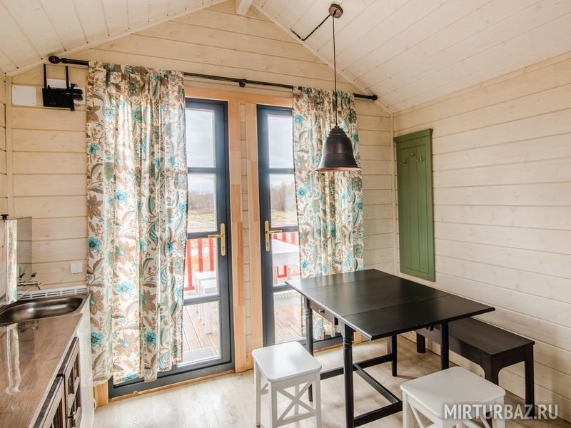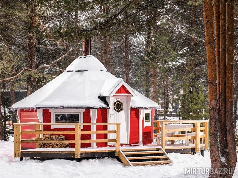 Семейные домики с видом на озеро, пруд и на хаски-парк. Предназначены для небольших компаний и семей до 6 чел. Домики теплые, с ТВ, диваном, столом и печью-камином, барбекю. Без санузлов, но есть подогреваемая вода в рукомойнике внутри.