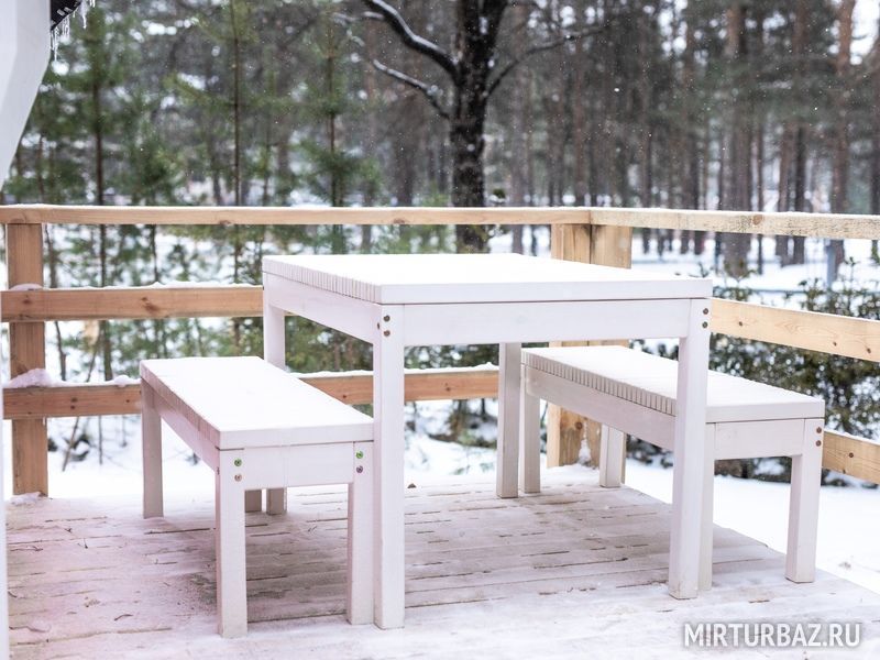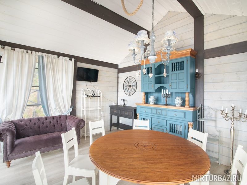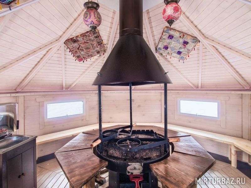 Вип-домик «Шампань» — дизайнерский домик с круглым столом на 8 чел. приватным расположением и большой крытой террасой. Этот дом создавался и декорировался с особой тщательностью и предназначен для деловых встреч, романтических ужинов и изысканных мероприятий для небольшого, узкого круга гостей. Дом теплый, с печью каминного типа, небольшой прихожей и санузлом с биотуалетом.