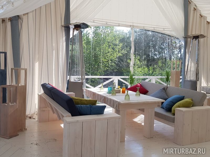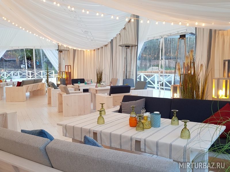 К Вашим услугам легкий летний ресторан в большом белоснежном шатре со стильной деревянной мебелью и великолепной кухней.