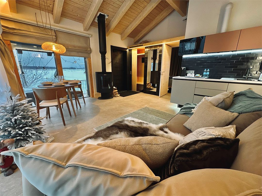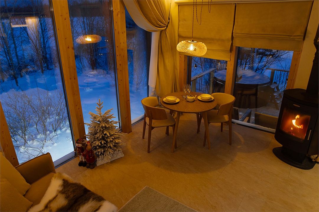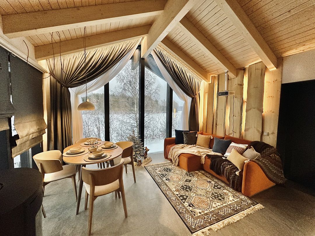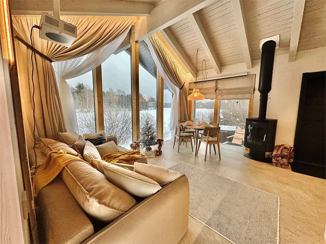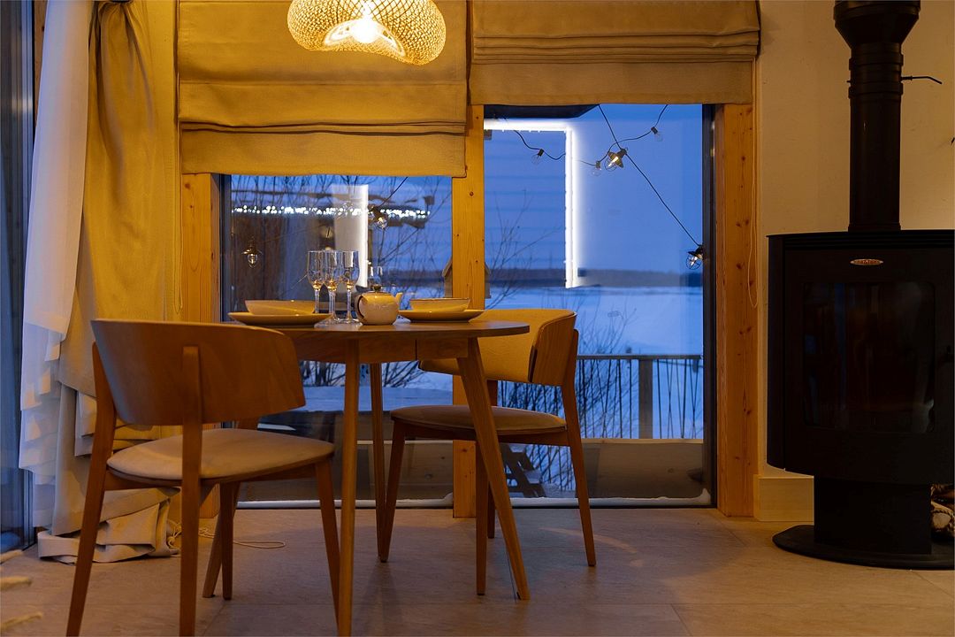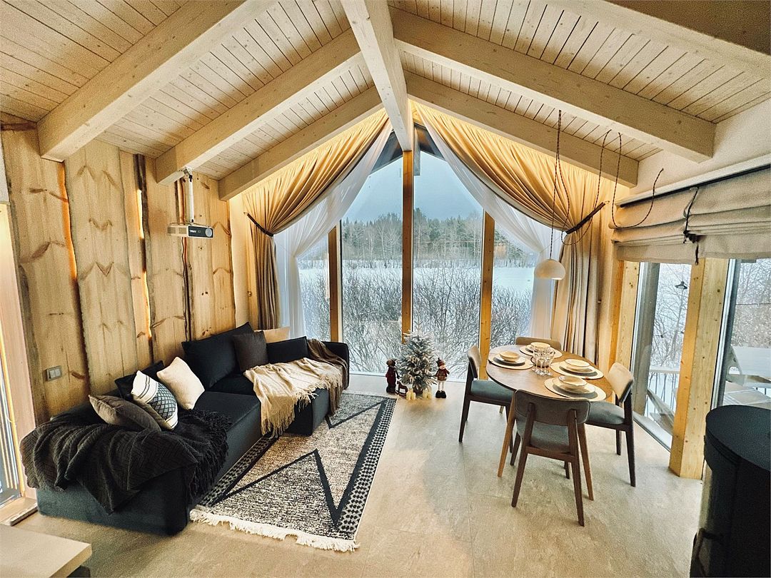Дома расположены на высоких сваях, защищающих от паводков, и предлагают исключительный комфорт. В каждом лодже вас ждет просторная гостиная с камином и панорамным видом на озеро Еляты, полностью оборудованная кухня, стильная спальня с большой кроватью и премиальным бельем, современный санузел с душевой кабиной и собственная мини-сауна с печью Sangens и нефритовыми камнями.