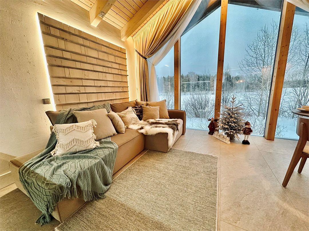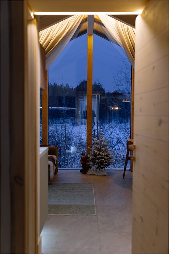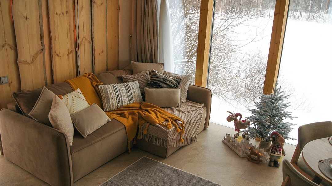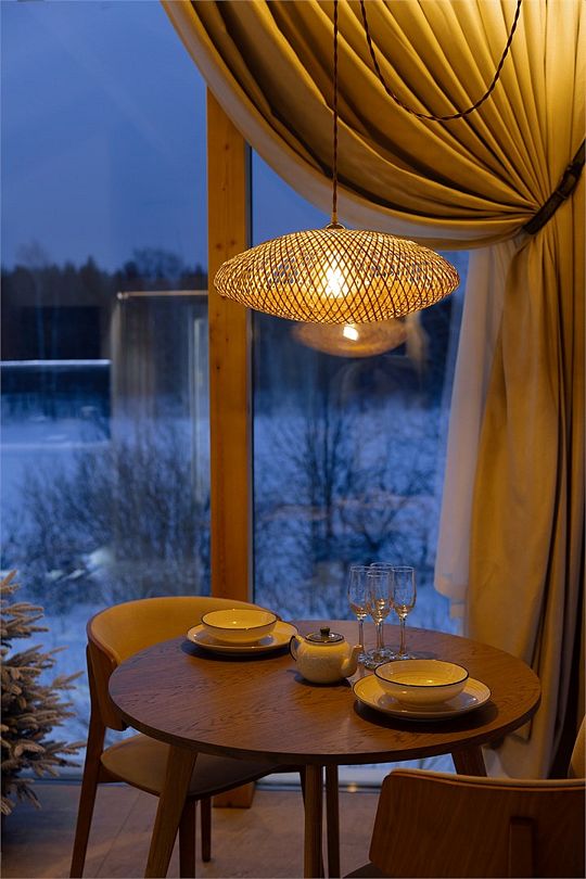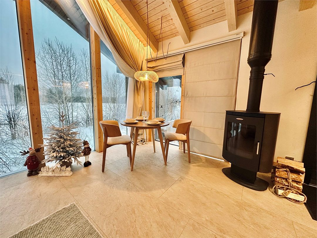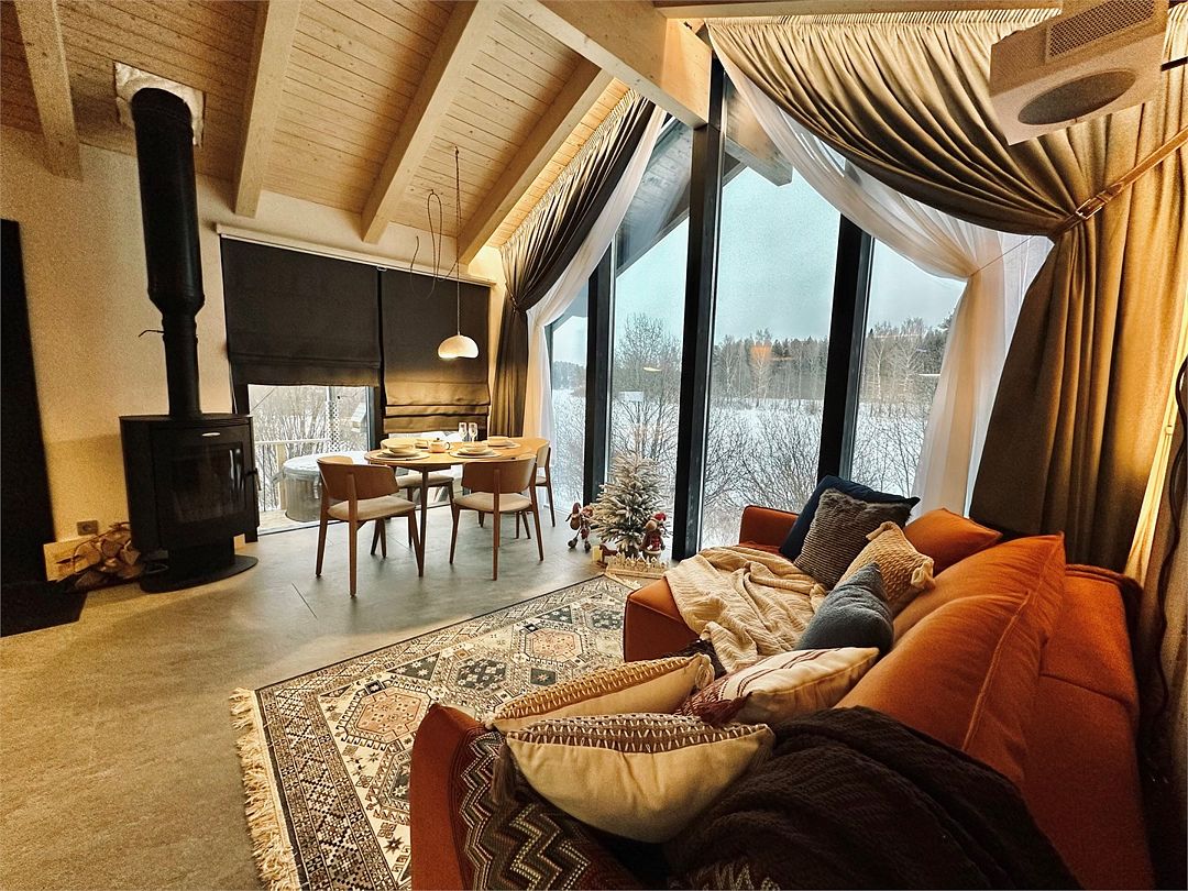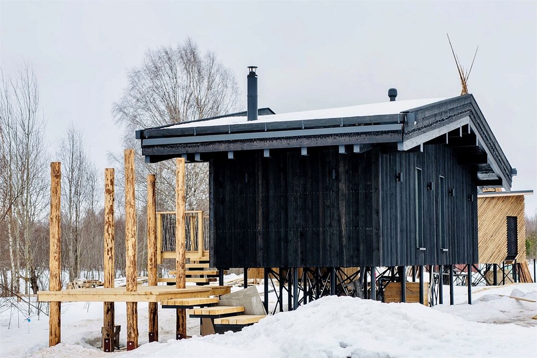 Дома расположены на высоких сваях, защищающих от паводков, и предлагают исключительный комфорт. В каждом лодже вас ждет просторная гостиная с камином и панорамным видом на озеро Еляты, полностью оборудованная кухня, стильная спальня с большой кроватью и премиальным бельем, современный санузел с душевой кабиной и собственная мини-сауна с печью Sangens и нефритовыми камнями.