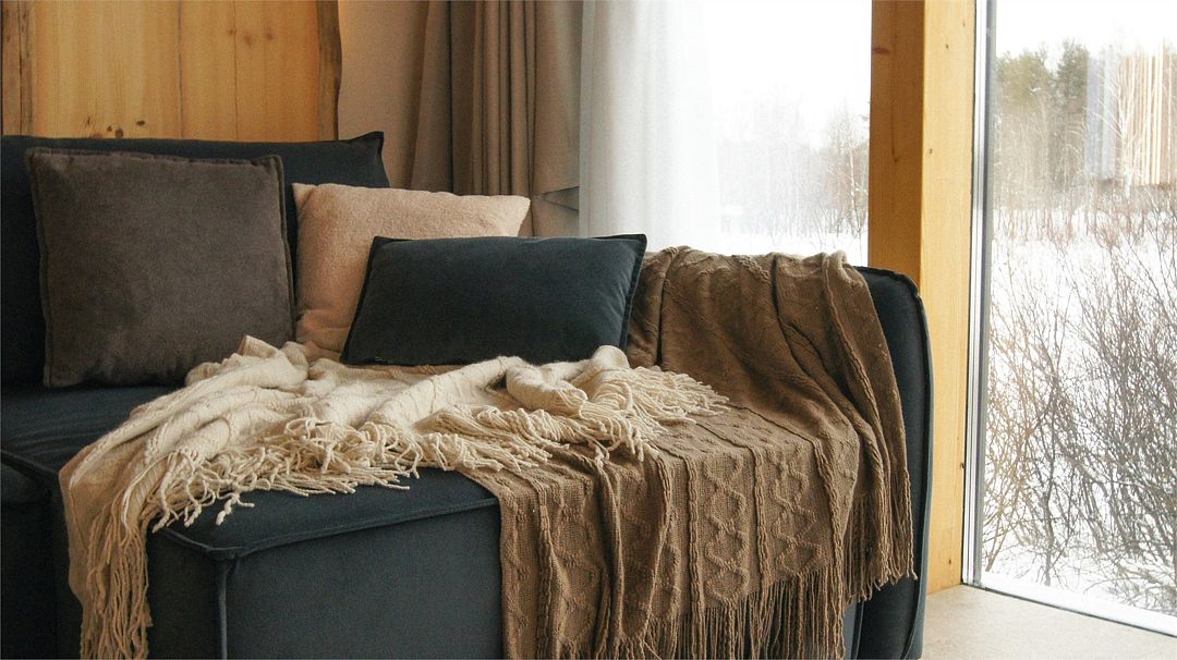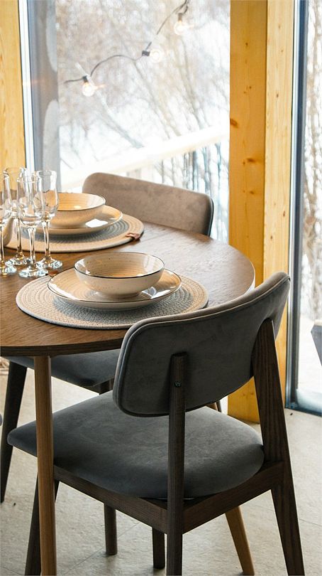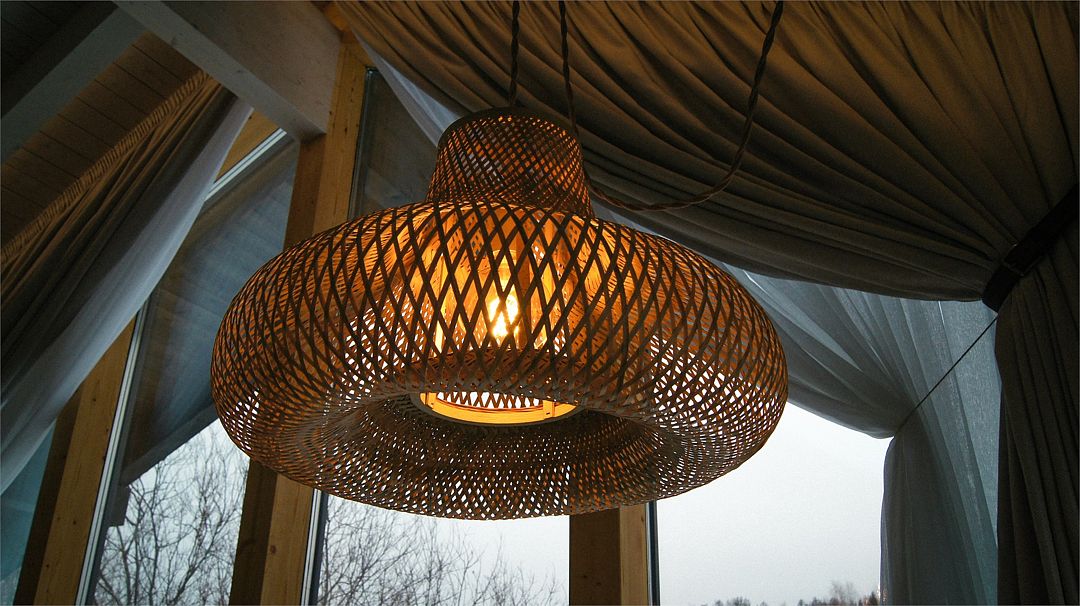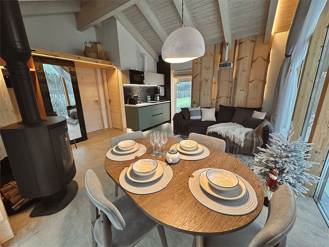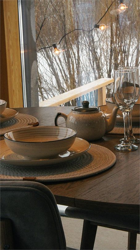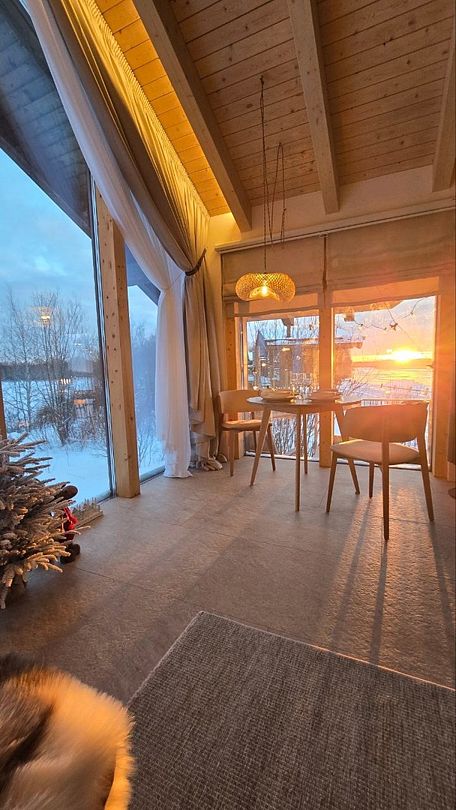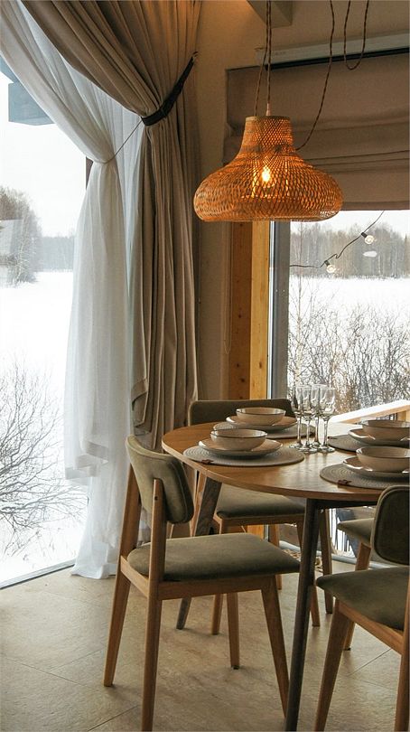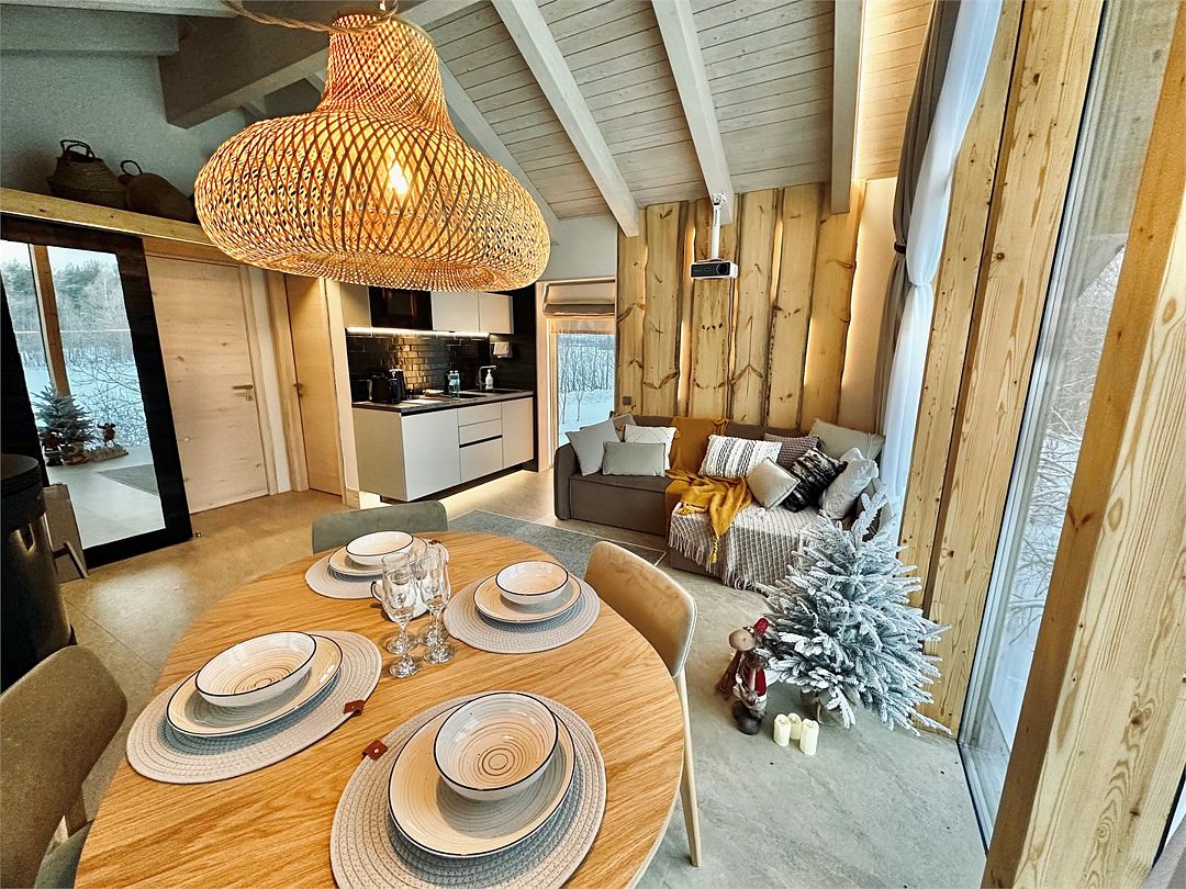 Дома расположены на высоких сваях, защищающих от паводков, и предлагают исключительный комфорт. В каждом лодже вас ждет просторная гостиная с камином и панорамным видом на озеро Еляты, полностью оборудованная кухня, стильная спальня с большой кроватью и премиальным бельем, современный санузел с душевой кабиной и собственная мини-сауна с печью Sangens и нефритовыми камнями.