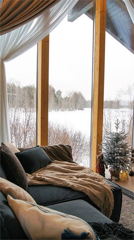 Светлая спальня с King Size кроватью и панорамным видом на озеро, зона для отдыха с панорамным окном оборудована диваном, печью-камином и проектором на всю стену, ванная комната с просторным душем, полностью оборудованная кухня с кофемашиной и обеденной зоной, вместительная гардеробная и терраса для отдыха с купелью.