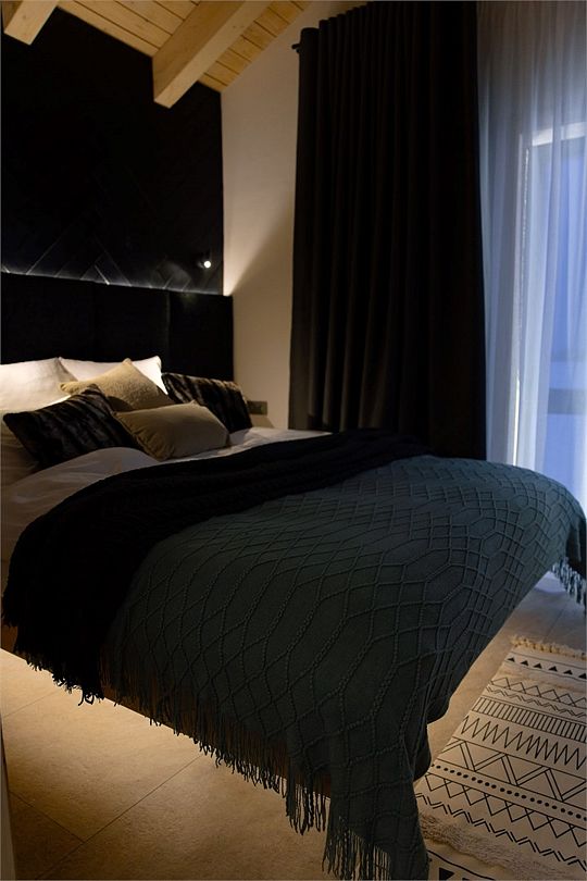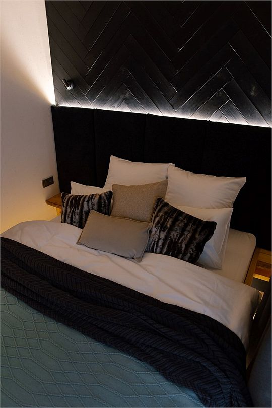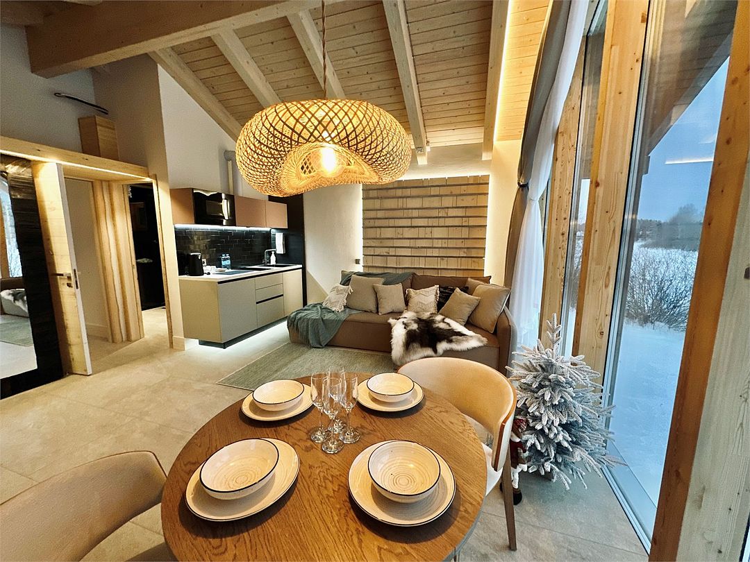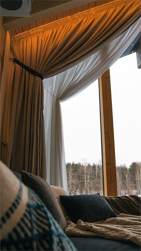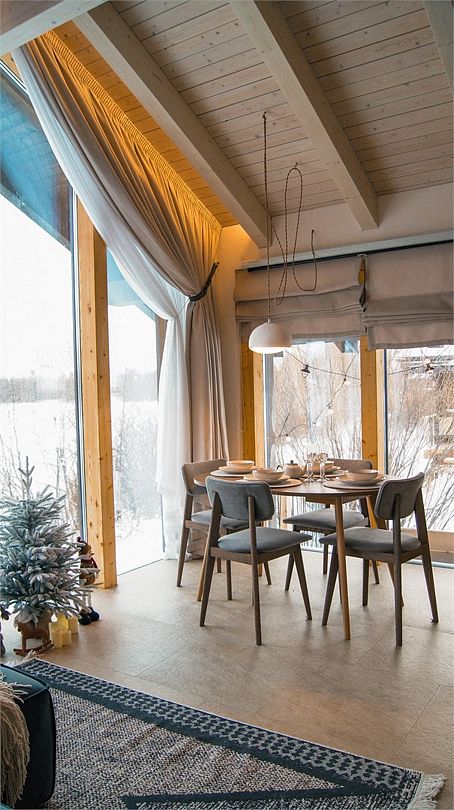 Светлая спальня с King Size кроватью, зона для отдыха с панорамным окном оборудована диваном, печью-камином и проектором на всю стену, ванная комната с просторным душем и сауной, полностью оборудованная кухня с кофемашиной и обеденной зоной, вместительная гардеробная и терраса для отдыха с купелью.
