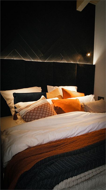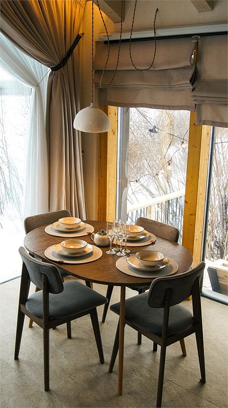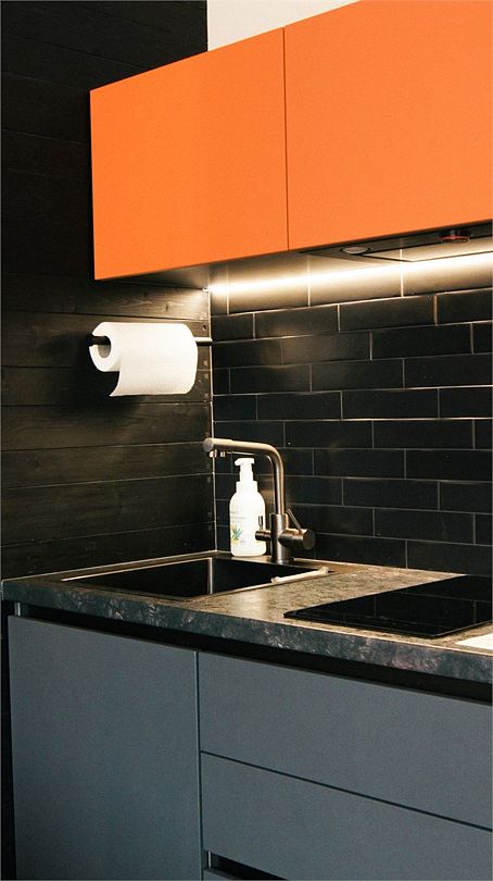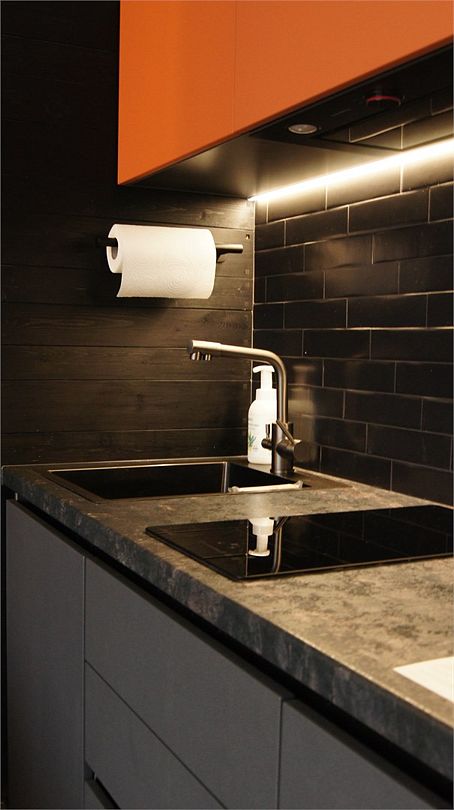 Интерьер выполнен в скандинавском стиле: экологичные материалы, природные фактуры, натуральные цвета. Преобладающие оттенки в интерьере: черный, бежевый, оранжевый, коричневый.