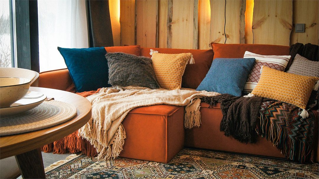 Интерьер выполнен в скандинавском стиле: экологичные материалы, природные фактуры, натуральные цвета. Преобладающие оттенки в интерьере: бежевый, оранжевый, коричневый.