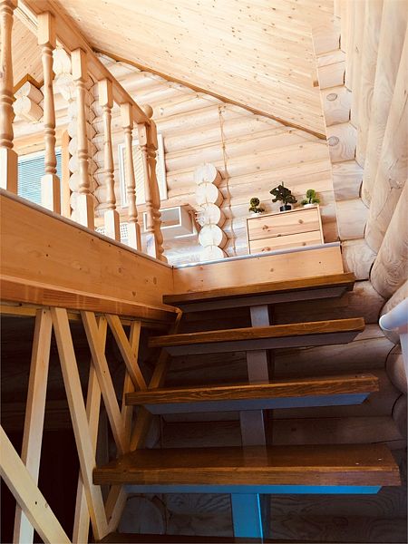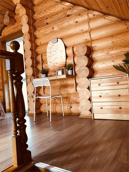 Двухэтажный дом из бруса, на первом этаже расположен сан-узел, душевая, гардеробная, кухонная зона.