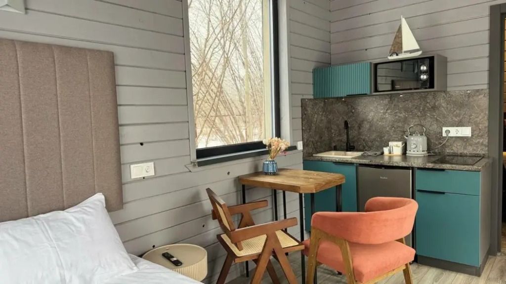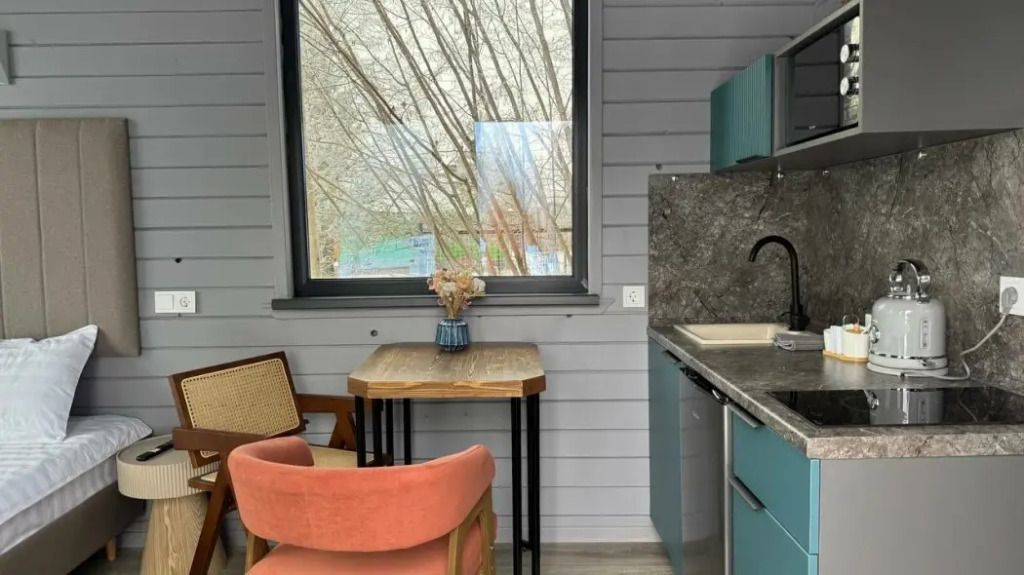 Внутри уютная студия гостиная с комфортной двуспальной кроватью и современными текстилем, создающими атмосферу уюта и спокойствия. Ванная комната оснащена душевой кабиной и всеми необходимыми туалетными принадлежностями. Мини-кухня оборудована всем необходимым: холодильником, плитой, микроволновой печью, тостером и посудой, чтобы вы могли готовить любимые блюда прямо на месте.