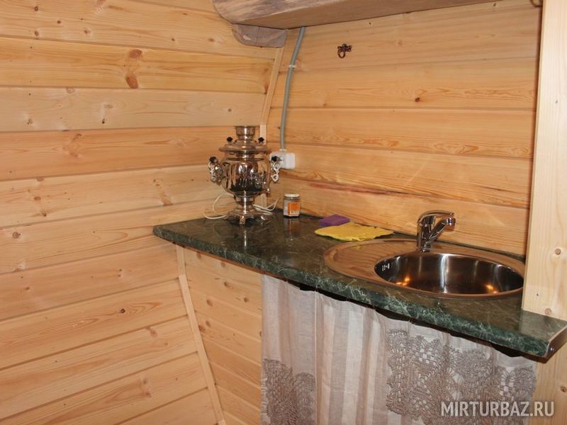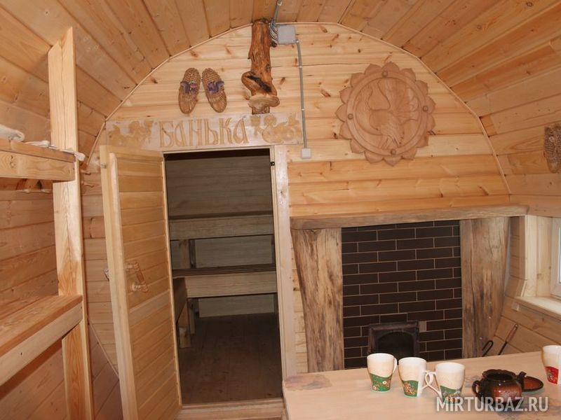 В бане имеется жаркая парилка с каменкой, лохань с холодной водой и уютная комната отдыха с самоваром, телевизором и радио. Вместимость до 8 человек.