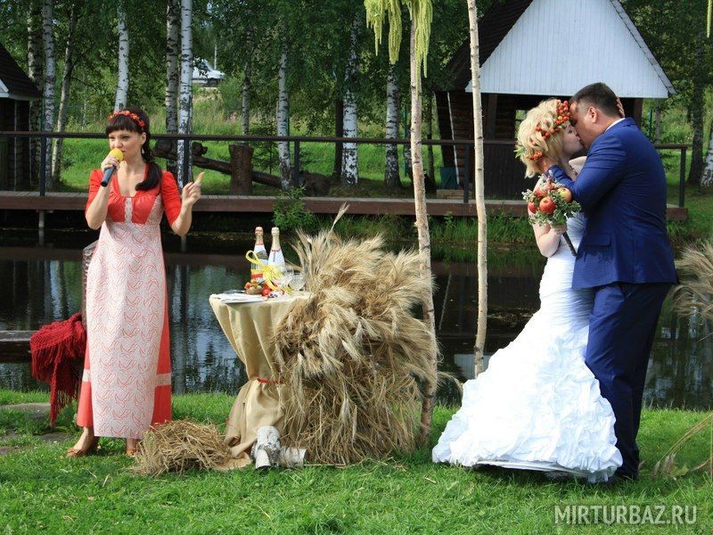 Регистрация брака на природе, что может быть лучше? Если Вы празднуете свадьбу в кафе-баре, Вам будет предложено воспользоваться прекрасной поляной с красивым прудом, беседками и резными фигурками совершенно бесплатно!