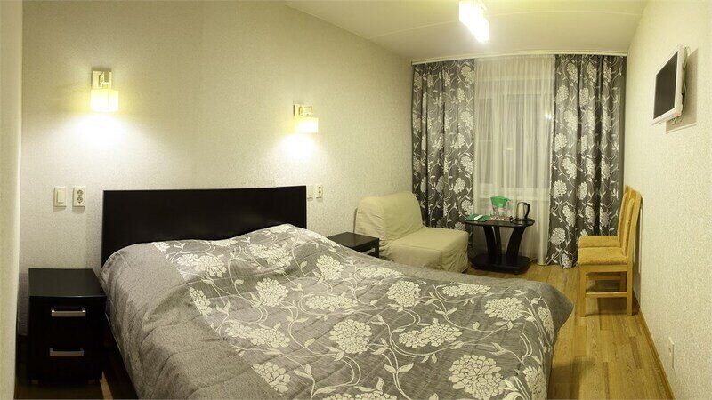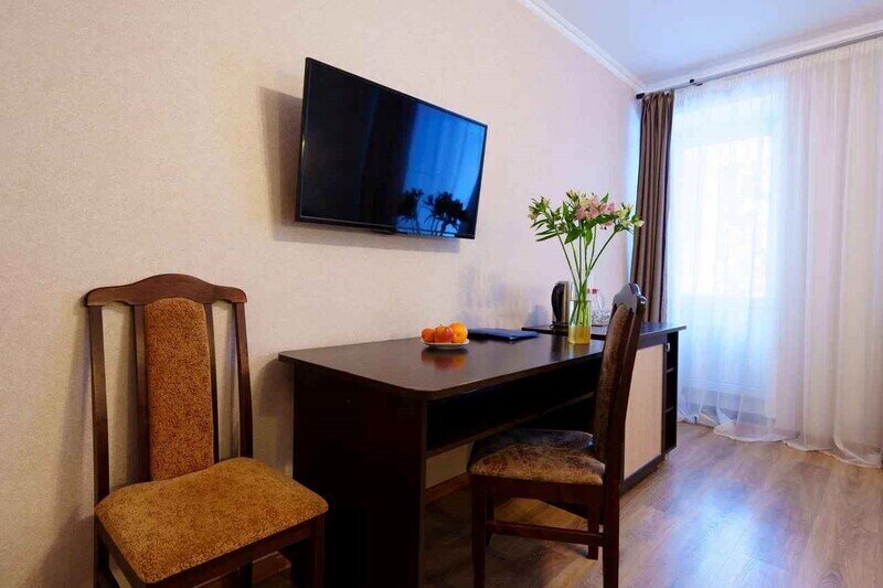 Оснащение номера: отдельный вход, журнальный столик, кресло-кровать, стулья, шкаф для одежды, прикроватные тумбочки, светильники, ЖК-телевизор, спутниковое телевидение, холодильник, электрочайник, фильтр для воды, информационная карта, меню, санузел с душем, жидкое мыло, комплекты из 3-хполотенец, фен.