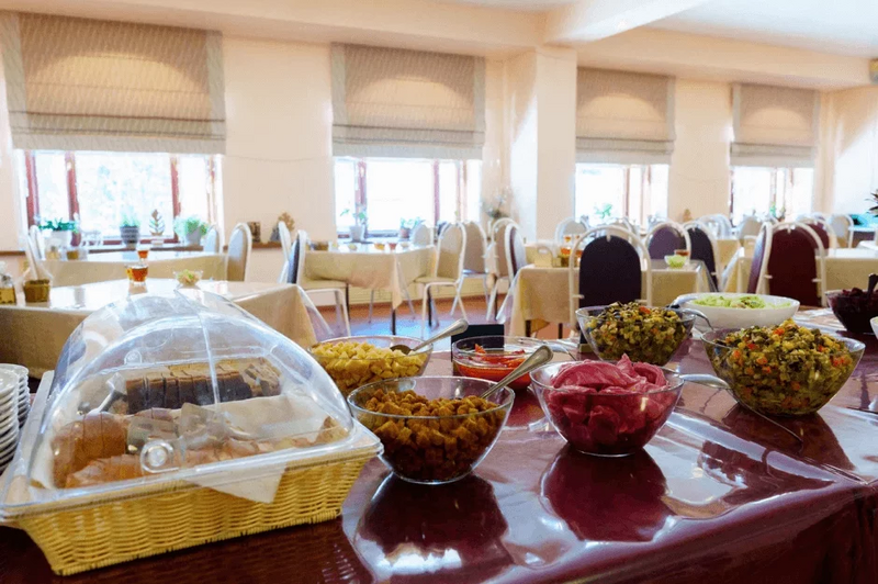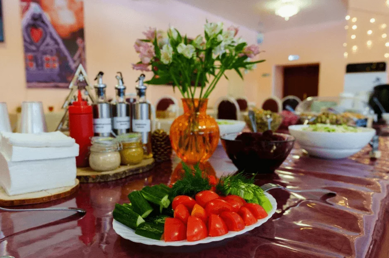 - Трёхразовое комплексное питание с элементами "шведского стола", детское меню. По назначению врача - диета №5 и диета №9.