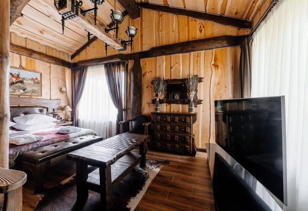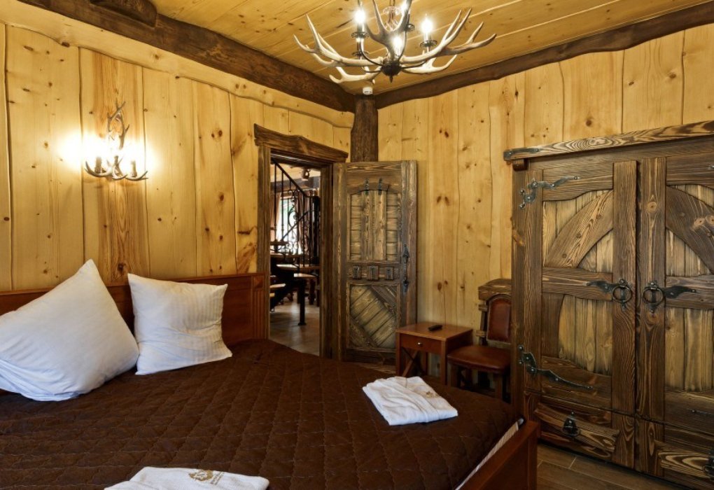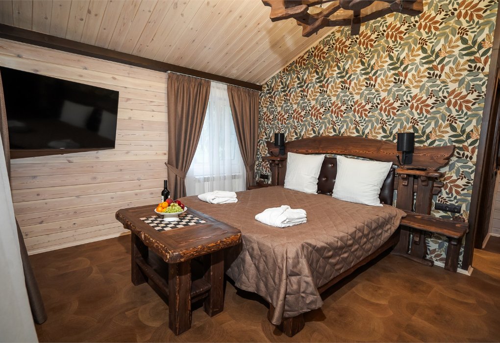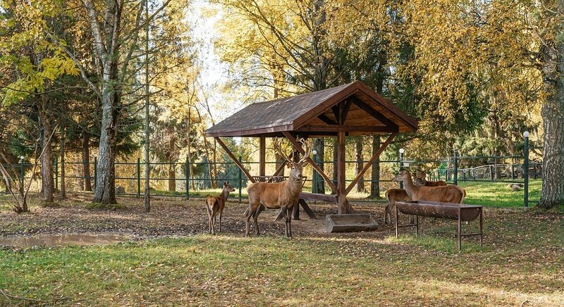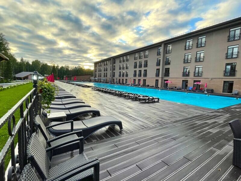 Вторую ночь нам предстояло встретить в охотничем домике, просторный номер встретил нас высокими потолками, массивной мебелью и такими же масивными предметами интерьера, а так же просто гиганским телевизором с диагональю 70+. из плюсов номера это его размер, близость к главному зданию и к зверинцам, очень запомнился енот, козленок, олени и кролики. Крики павлинов будто переносят в субтропики.... Из минусов, это отсутствие красивых видов из окон(номер 24) и хорошая слышимость соседей через дверь-портал, но длилось наше прибывание в здесь не долго, ближе к вечеру начался ливень стеной, и по нашему возвращению в номер обнаружили течь с потолка в ванной комнате, очень грустно что не повезло с исполнителями кровельных работ, и такой красивый ремонт страдает, звонок администратору, и мы переезжаем в vip-номер, с порога погружаясь в атмосферу комфорта и стиля рококо, отдельная гардеробная, большая ванная комната с джакузи и выход к бассейну из номера, всё это оставило у нас только самые приятные воспоминания. К сожалению до открытия бассейна на улице оставалось несколько дней, компенсировали это купанием в закрытом бассейне и походами в сауну и джакузи. На удивление быстро прогрелась вода в реке Покша, купались в своё удовольствие, но душ на пляже работал только во время работы бара, как и туалет, и это большой такой минус, как и не было качелей, на каркасе висели только цепи, а так хотелось покачаться и сделать памятные фото, хочеться верить, что это всё из-за начала сезона...
