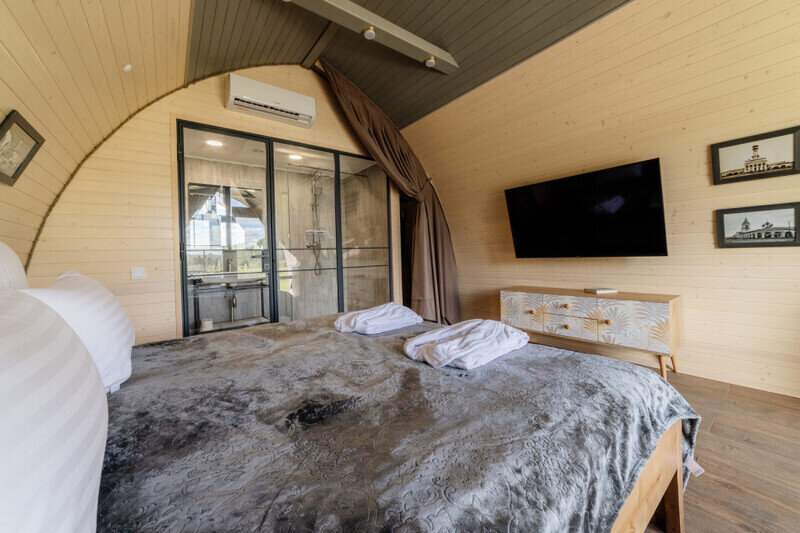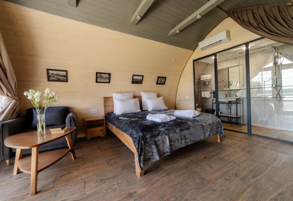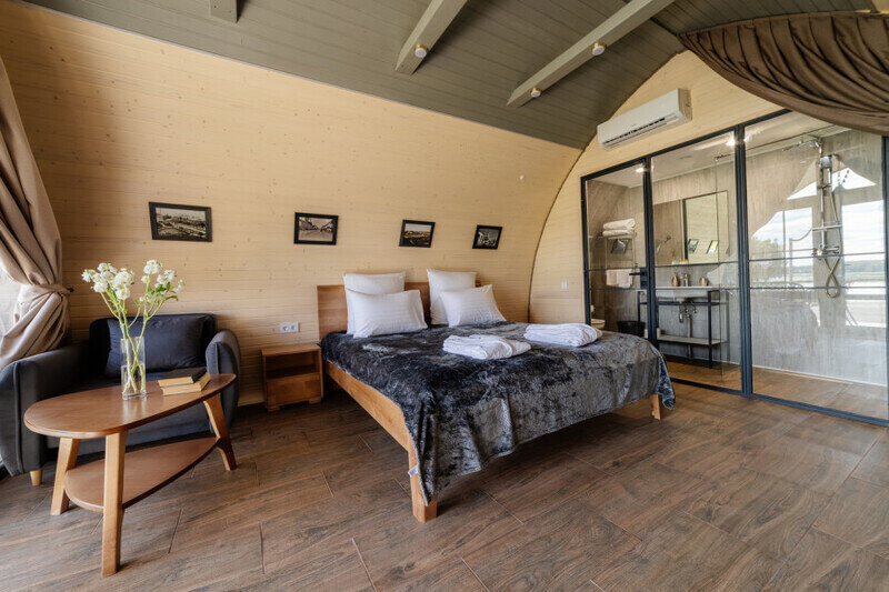Отель "Аристократ" уже при входе в ресепшен покорил наши взгляды богатством интерьера, огромные люстры, красивая мебель, ковры с фирменным логотипом. Первую ночь провели в глэмпинге- новый домик с круглой крышей и прозрачной стеной. Оболденный вид на озеро с лебедями и утками, собственная небольшая крытая терраса, в домике есть всё что нужно для от тапочек и до зонтиков. Нам он понравился больше всех-нет соседей за стенкой, можно созерцать природу в любую погоду, до пляжа рукой подать, очень уютный. Из недостатков на мой взгляд, это прозрачная стена в сан узел - при походах туда в ночное время освещаешь весь номер, а вода из душа дотекала до унитаза, но это всё пустяки.