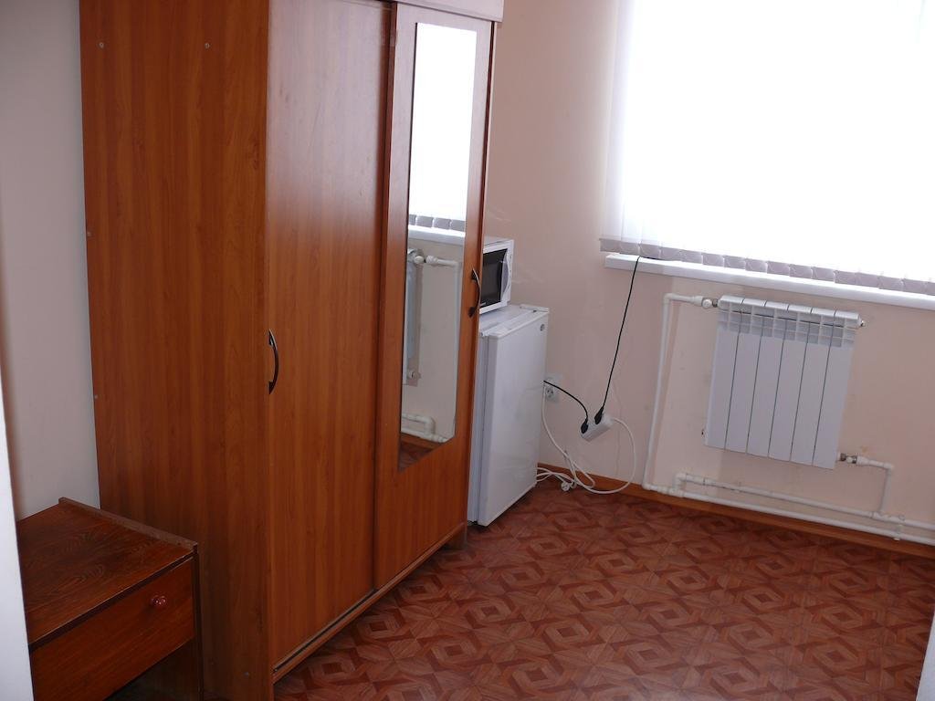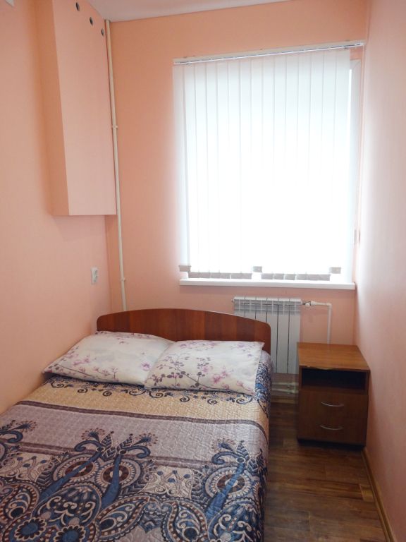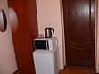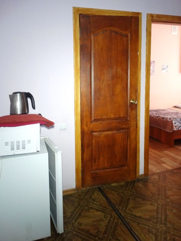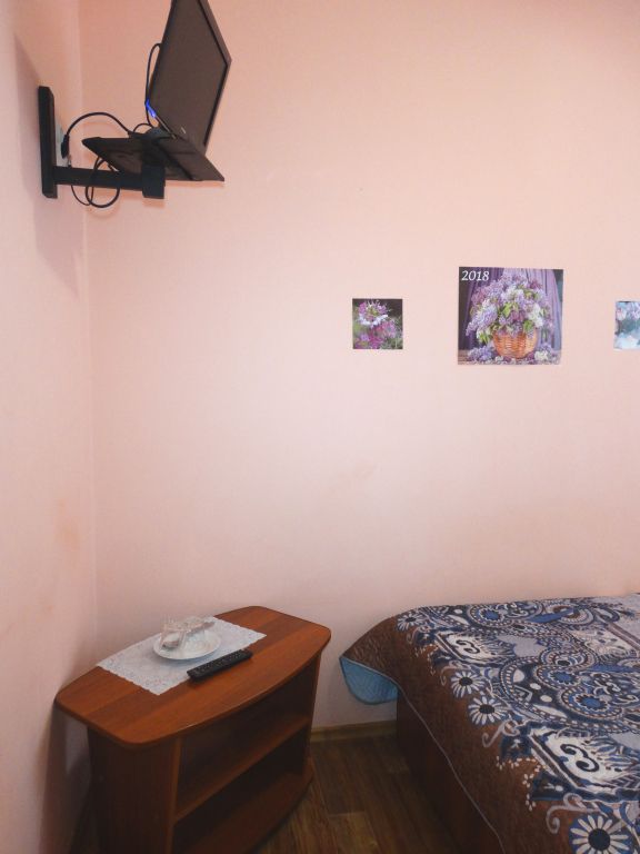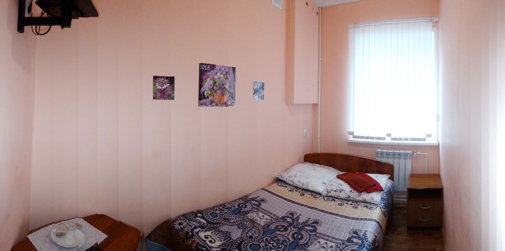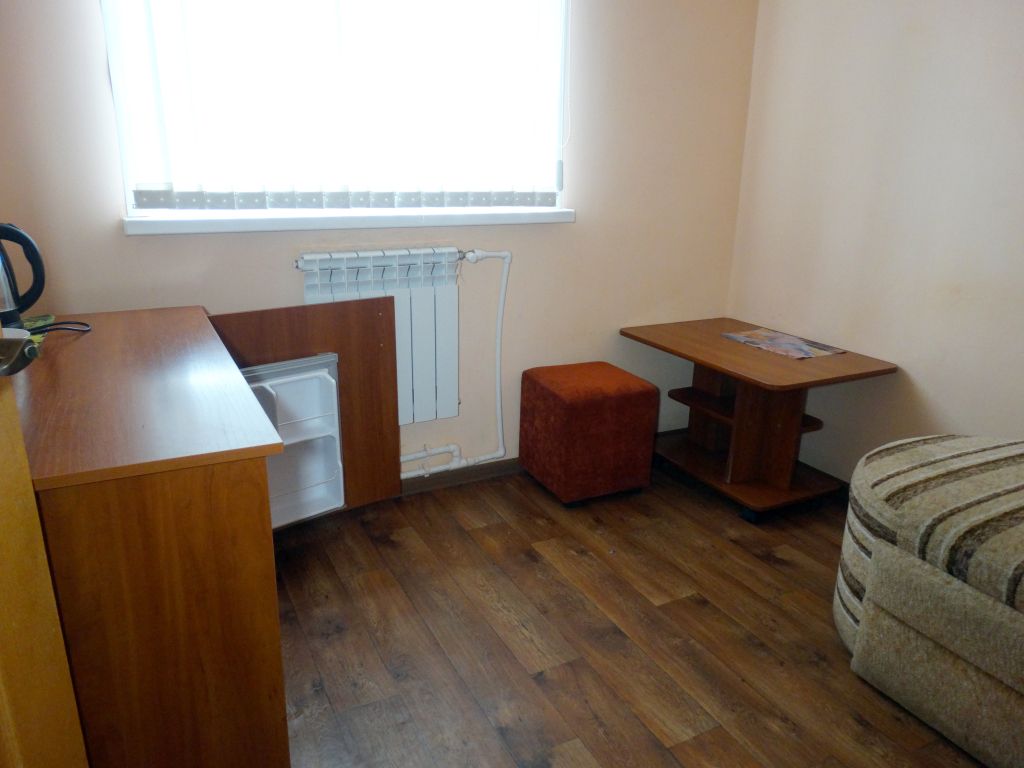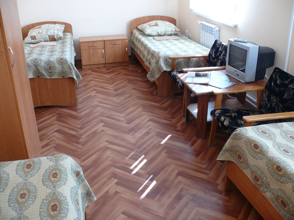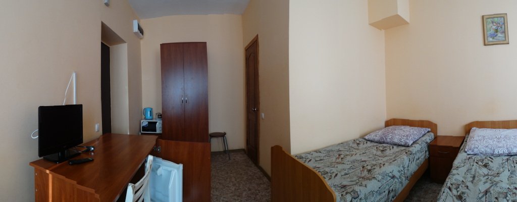Небольшая комната с двуспальной или двумя односпальными кроватями, телевизором и кабельными каналами. На две комнаты: санузел, прихожая. холодильник, микроволновка. чайник.