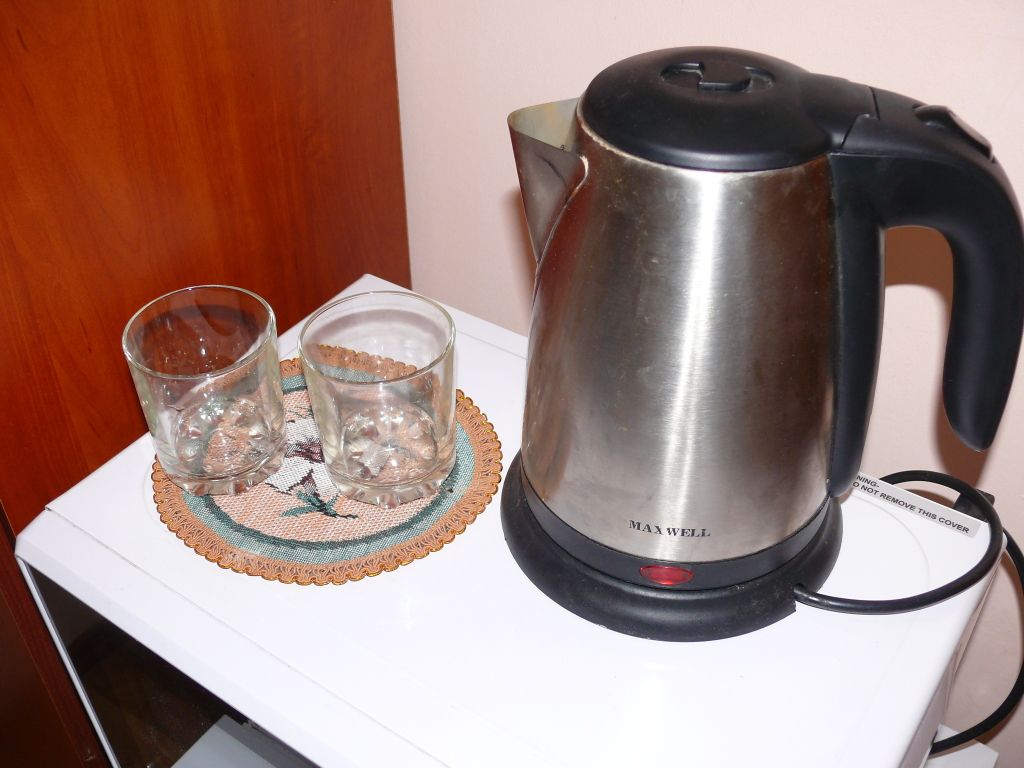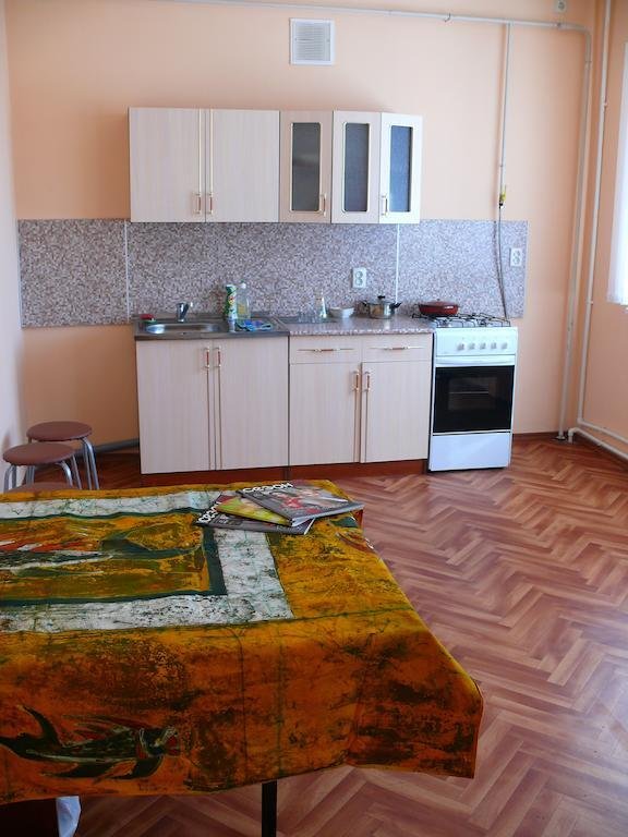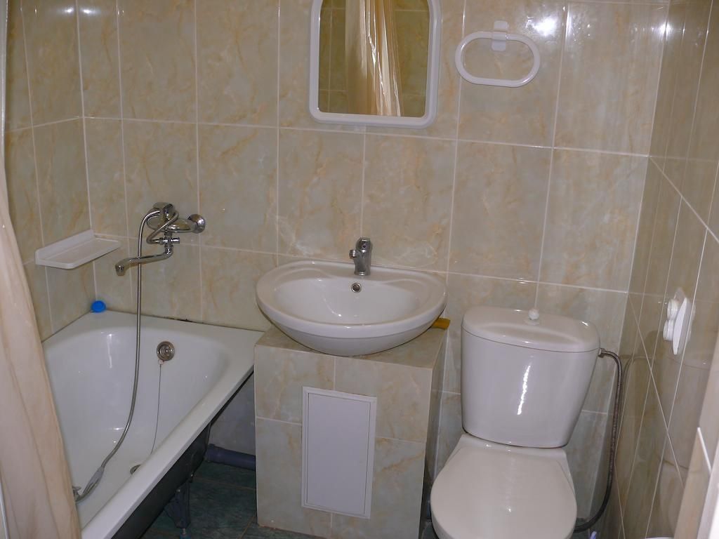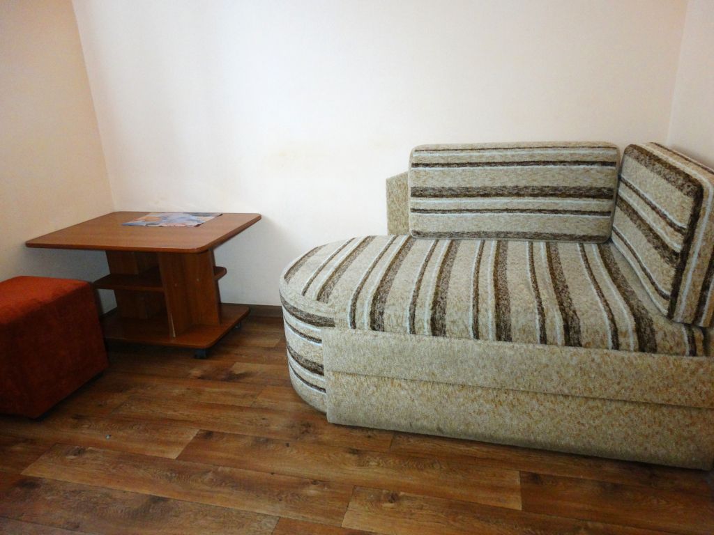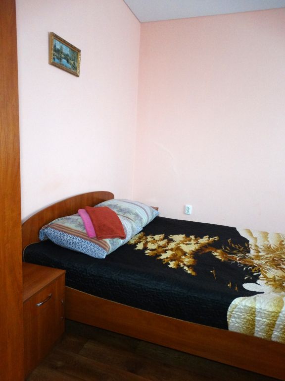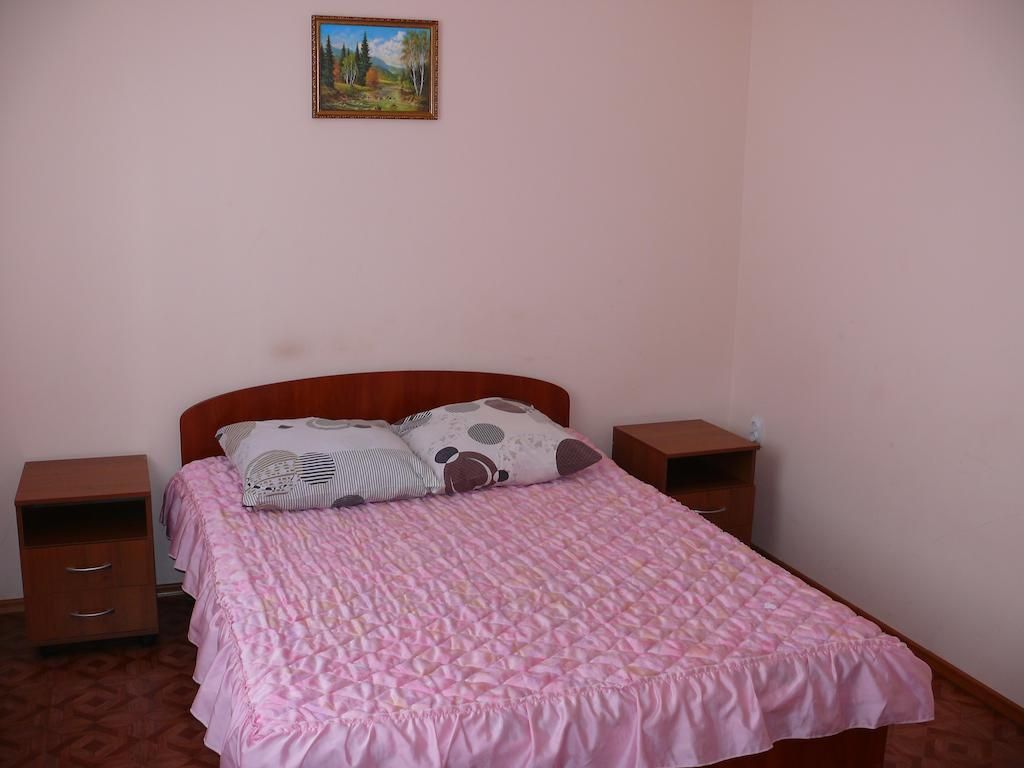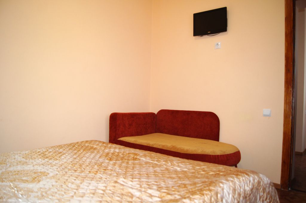 Небольшая комната с двуспальной или двумя односпальными кроватями, телевизором и кабельными каналами. На две комнаты: санузел, прихожая. холодильник, микроволновка. чайник.
