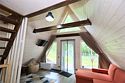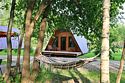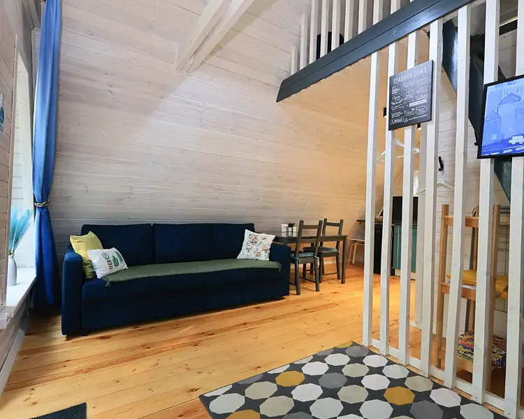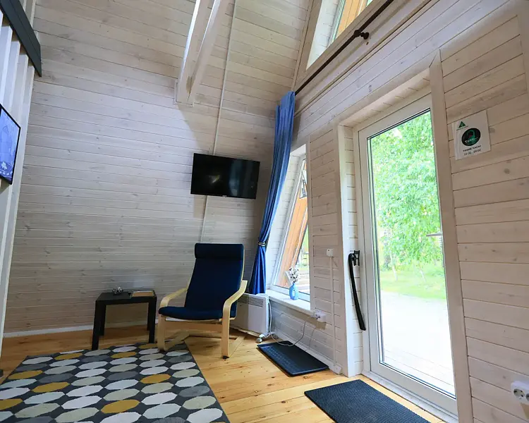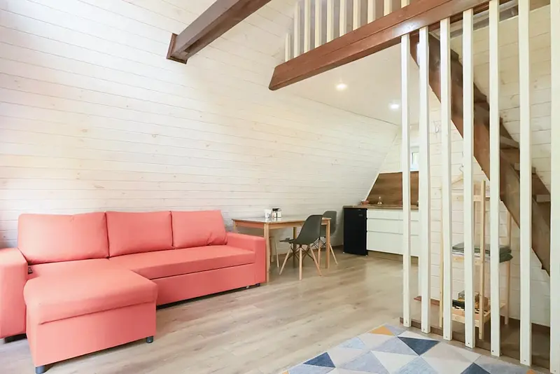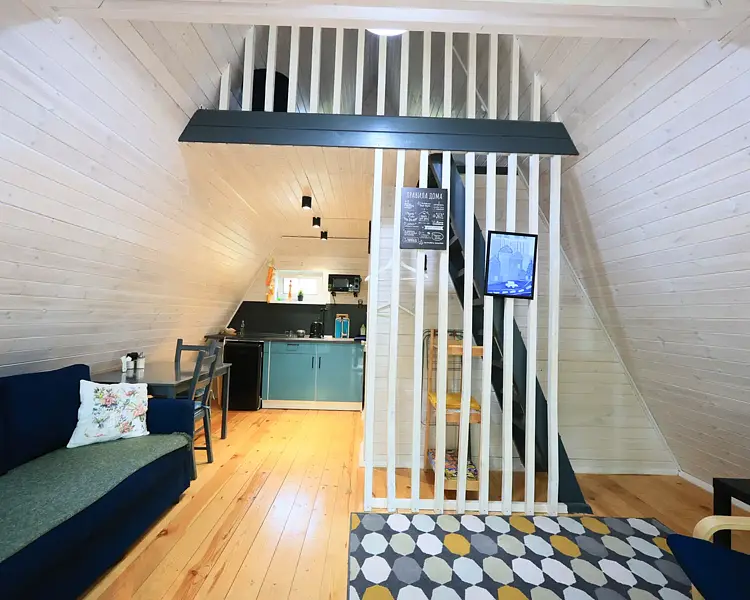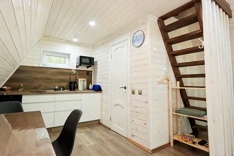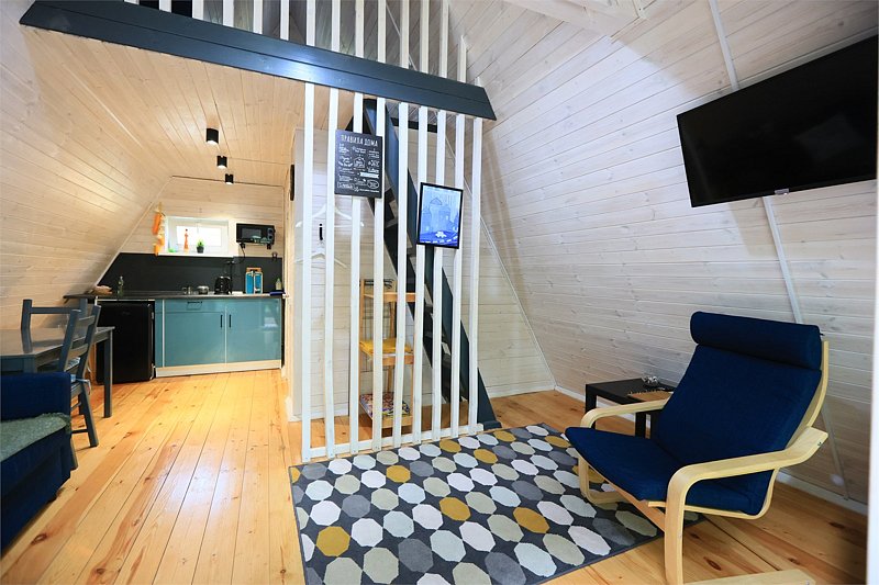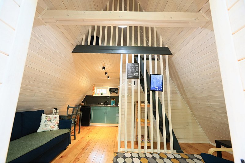 Внутри вас ждут ванная комната, гостиная и уютная двуспальная кровать на втором этаже, а также все необходимое для комфортного проживания: телевизор, Wi-Fi, настольные игры и полностью оборудованная кухня. Каждому домику сопутствует индивидуальная зона для барбекю, где можно наслаждаться вечерами под звуки природы.